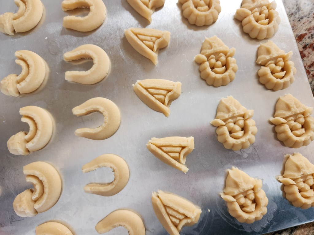 If you did the spritz cookies with a cookie press (following the link I gave earlier), here’s how they should look pressed, and then baked up and cooled, ready for decorating.