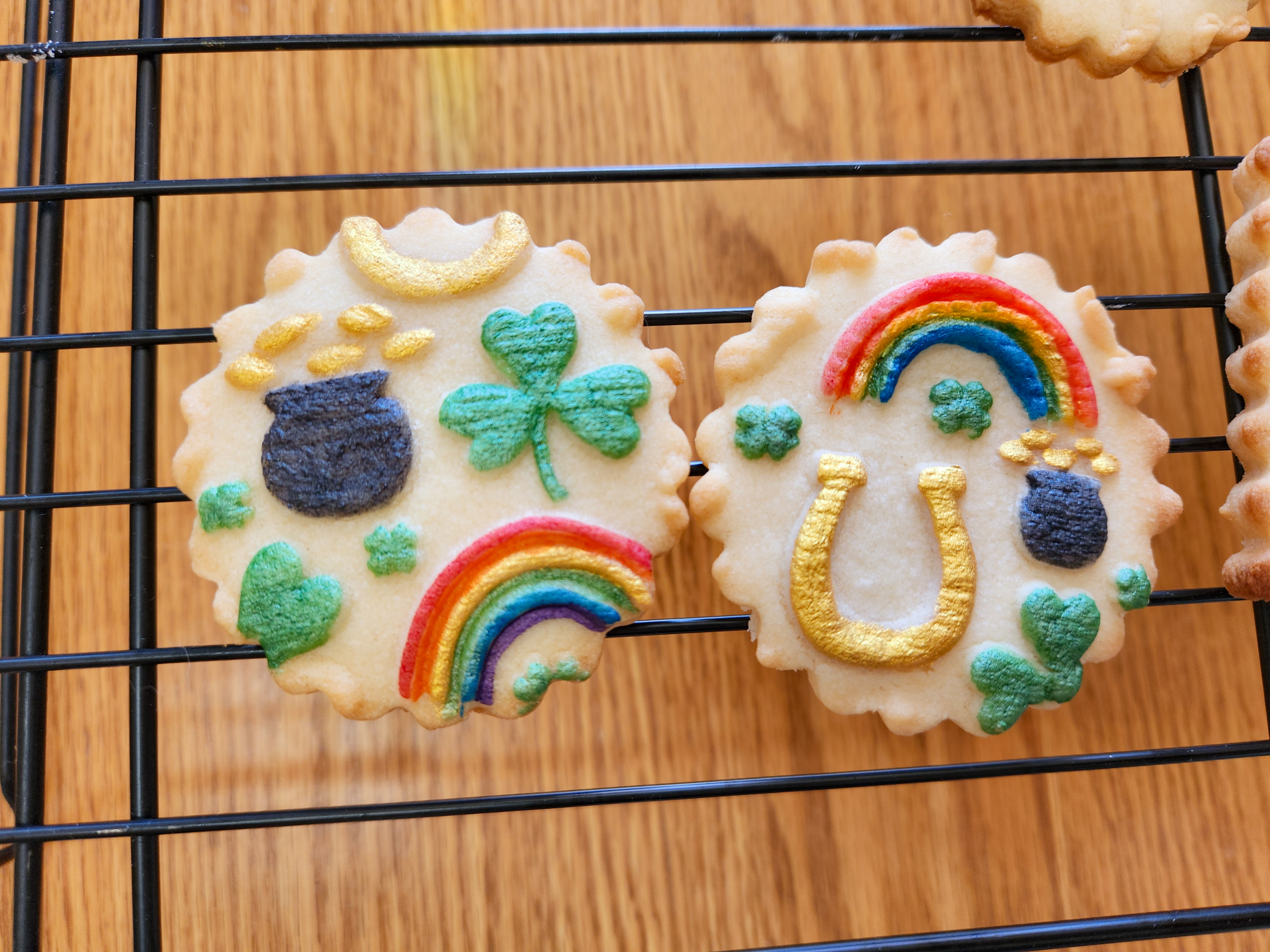 I didn’t do anything particularly fancy or surprising with these cookies. I followed the raised patterns on the cookies themselves and treated them like a coloring book. Shamrocks are green, coins are gold, etc. I painted one color at a time. All the green first, then all the black, then the gold, then the rainbows. Follow what I did in the main photo or make some creative changes!