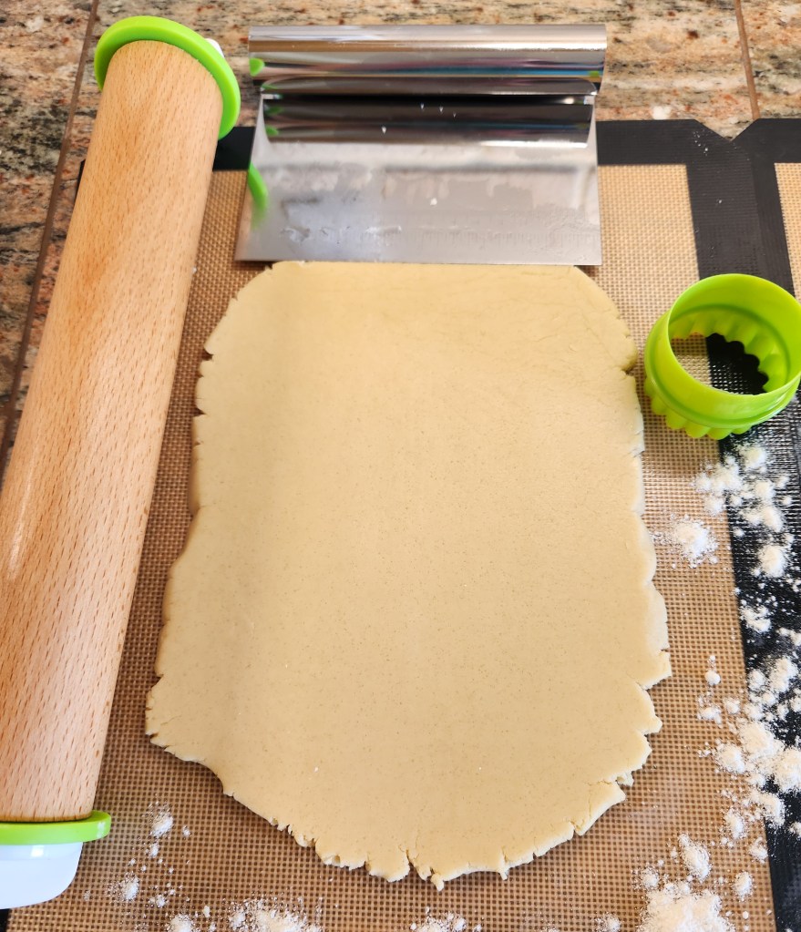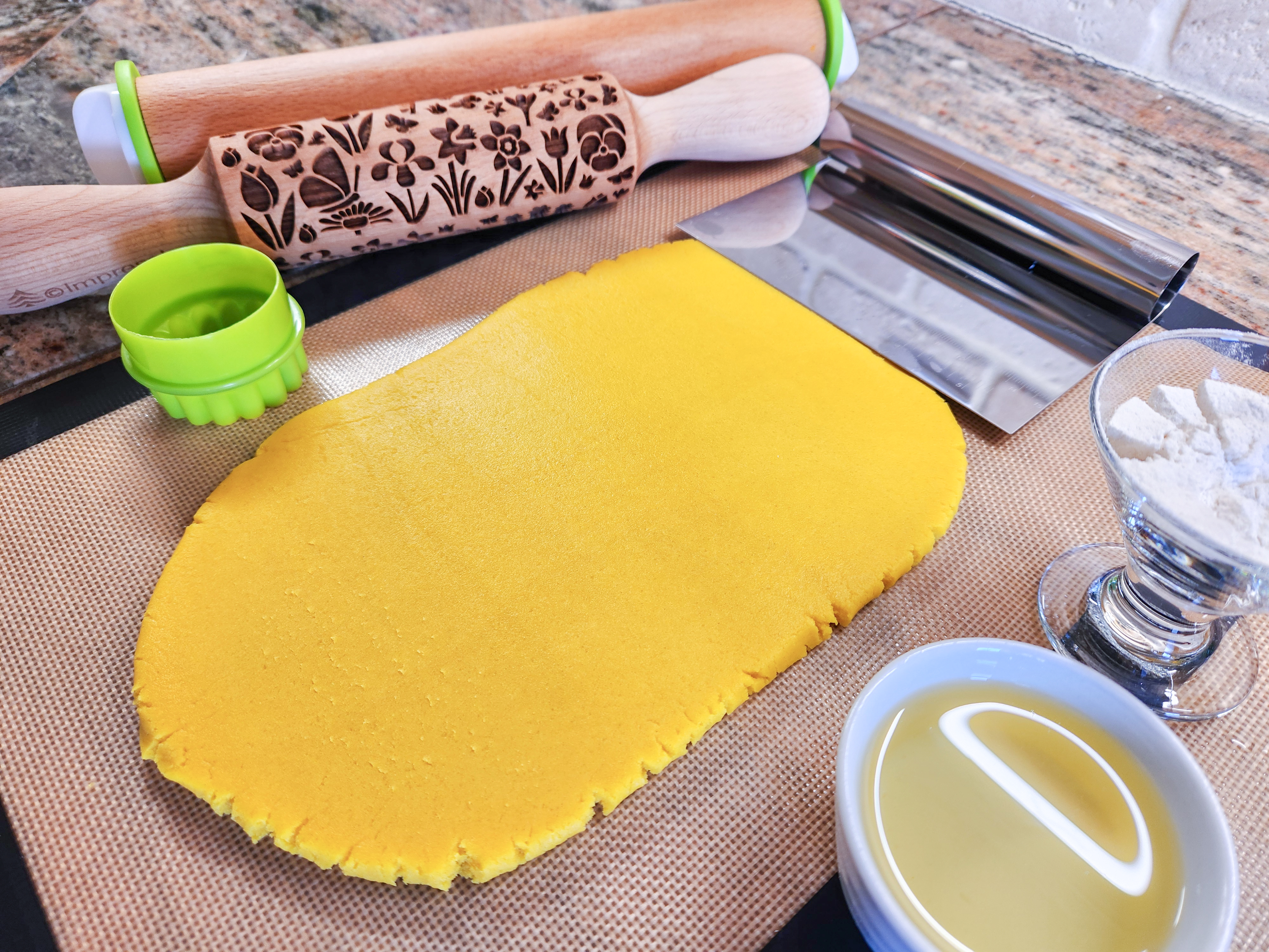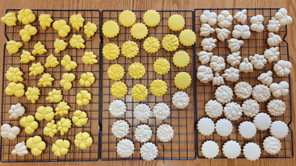 I have blogged vanilla-honey dough for both a cookie press and embossed rolling pins several times. So to keep this post short and to the point, I’m directing you to 2 of those posts for detailed instructions on making dough and pressing/rolling it.
