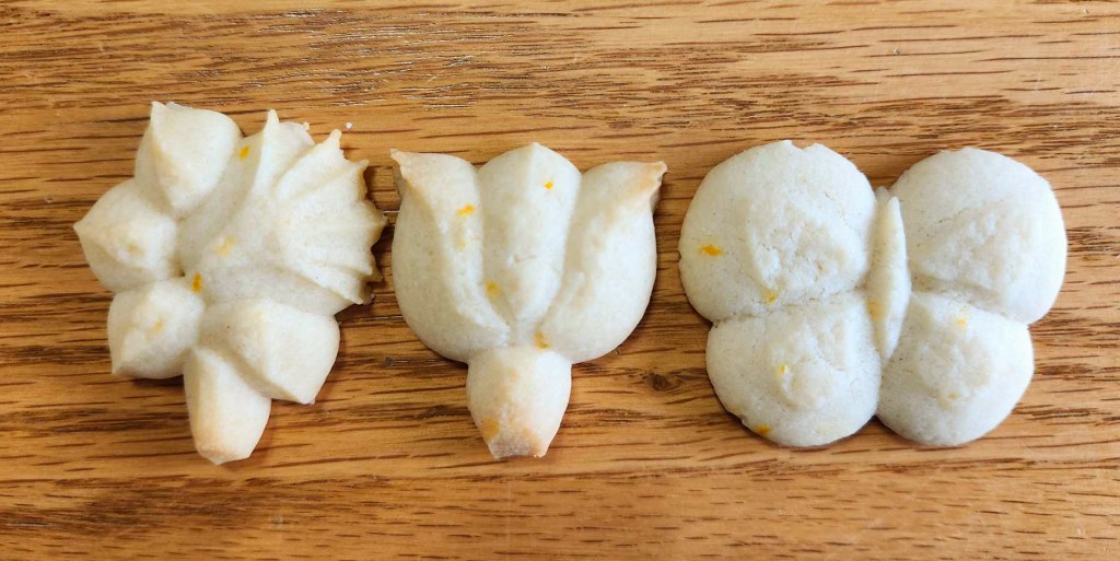 Spritz Cookie (cookie press) recipe, with the orange adjustment. Again, if you need full instructions see the Spring Spritz link above. I give a great explanation of how to achieve perfect spritz cookie dough texture for best pressing!