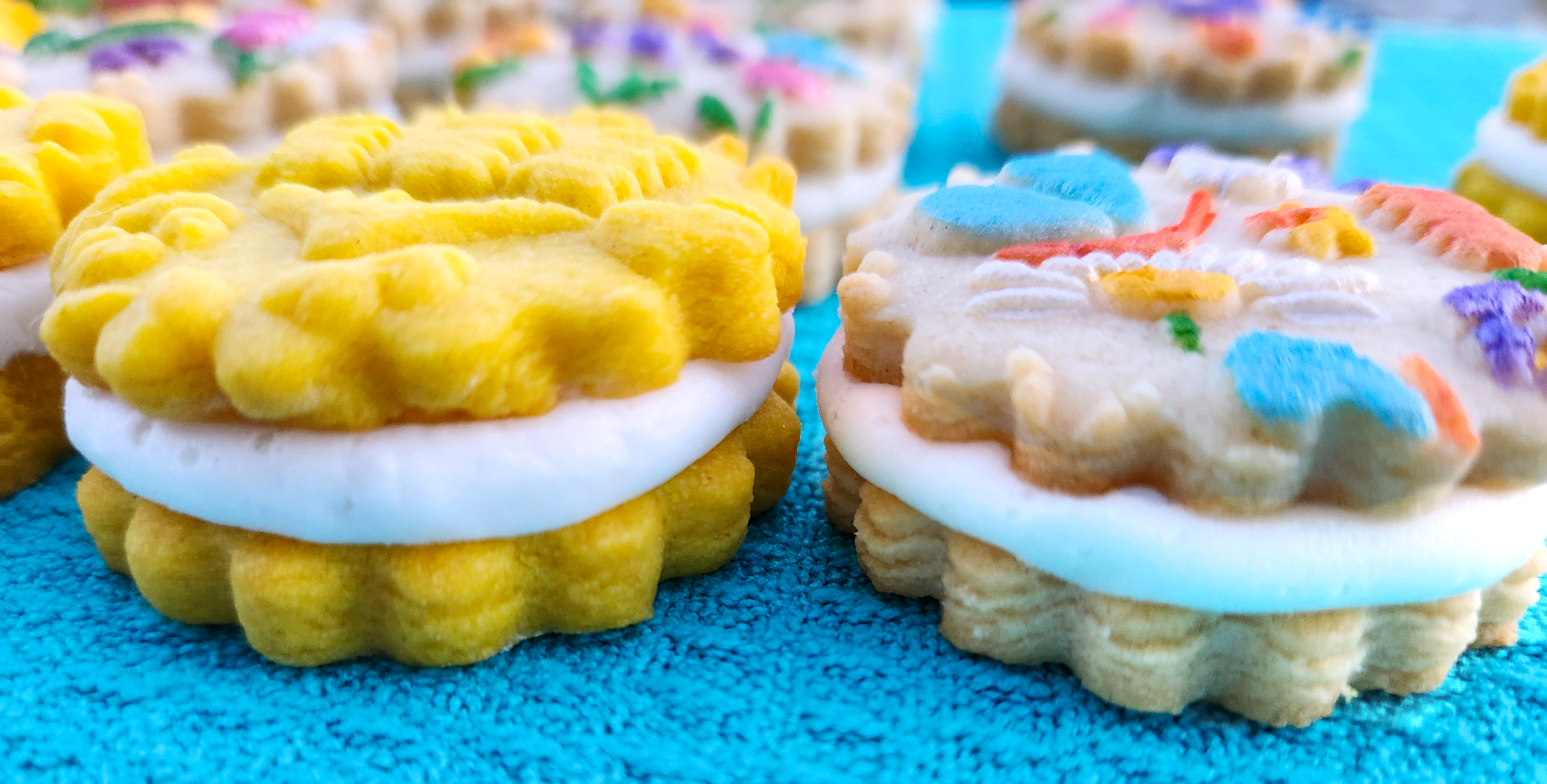The Mimosa buttercream steals the show in these lovely Spring treats! Mimosas are fun drinks often served at brunch, made from champagne and orange juice. Here I combined those flavors in a buttercream sandwich filling to create a “mimosa” sandwich cookie! The cookies themselves are subtly orange flavored, and are simply outstanding with the mimosa Buttercream!