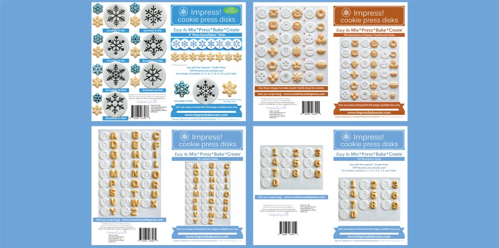Our website has all of our 200+ disk shapes, cookie press, embossed rolling pins, stamps, luster dusts, baking accessories plus more about our Women/Family Owned company! impressbakeware.com