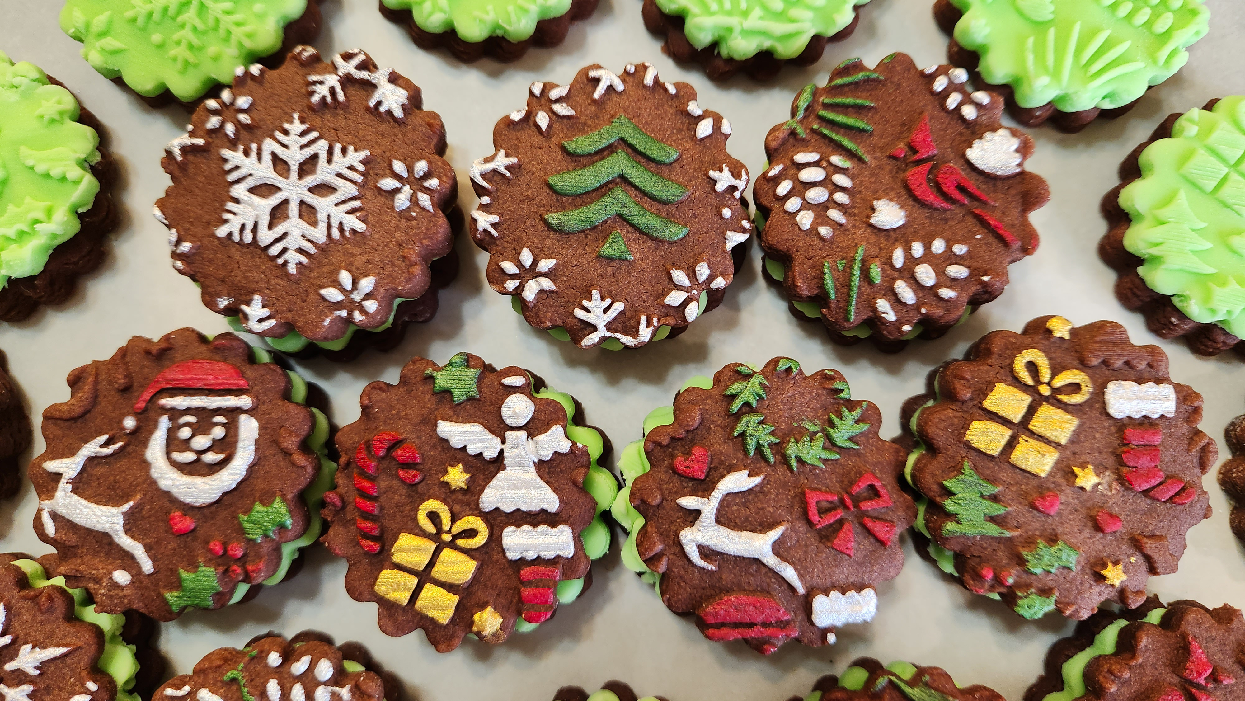 One of my FAVORITE things to do with rolled cookies is make them into sandwich cookies, and these bigger designs were literally designed for them. While the big shapes look great on big cookies, they also now fill the space of our 1 3/4″ cookie cutters. I measured as I designed so these new patterns would look great on large cookies and so that individual shapes would fit into but also fill the 1 3/4″ space. So instead of a sandwich cookie with Santa, a candy cane and a gift, now a big Santa, candy cane, or gift each fit on their own cookie! Both ways are beautiful, its just personal preference which you prefer! The new big designs are easier to paint with luster dust if you use that technique.