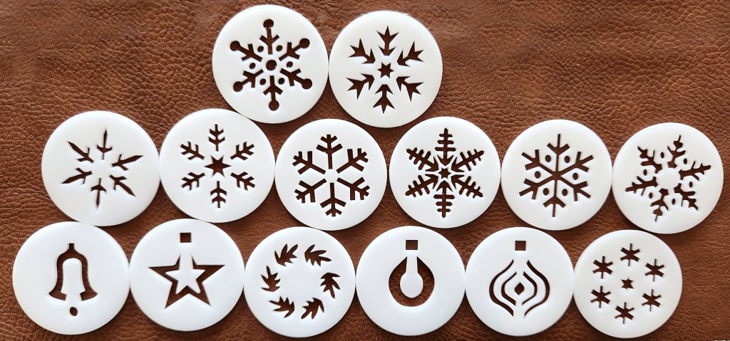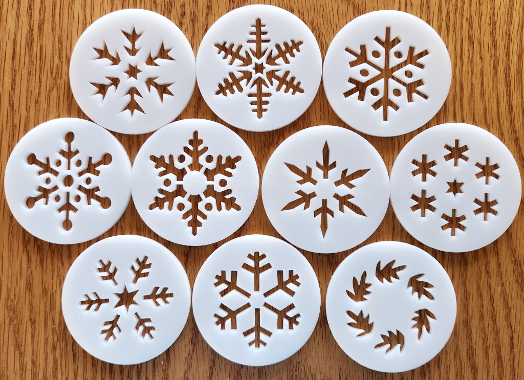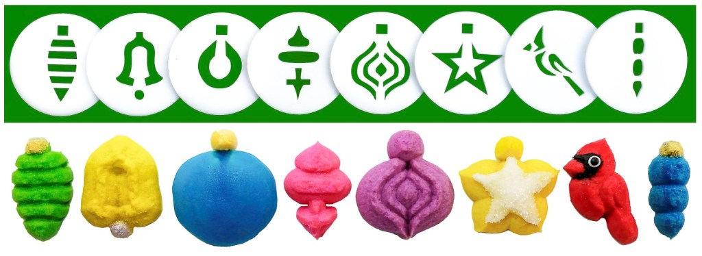 In the main photo above I show 9 of our 16 snowflakes shapes and the wreath. Here’s our Snowflakes and More Snowflakes! disk sets, and our Christmas Two set that has the wreath. Later I also show cookies made with 4 of our Christmas Ornaments disks!