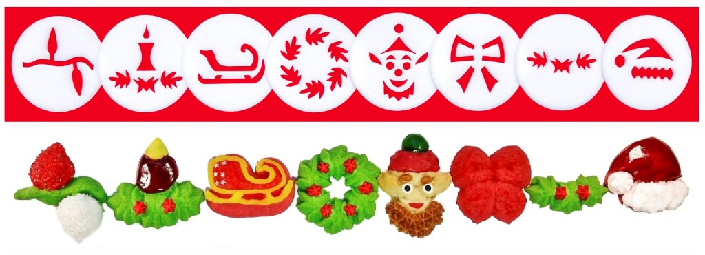 If using a one-click-per-cookie type press remember that you don’t always have to follow that guideline. Some shapes may take more or less than one click and that’s ok! Cookies don’t have to come out in even “clicks”. One click, half a click, it doesn’t matter. A press (any press) is a dough pump (it’s kind of like a caulking gun). It’s simply a mechanism for pumping dough out, however many (or few) “clicks” it takes. Again, you can read all about that in the Troubleshooting and Decorating Tips page if you’re new to this.