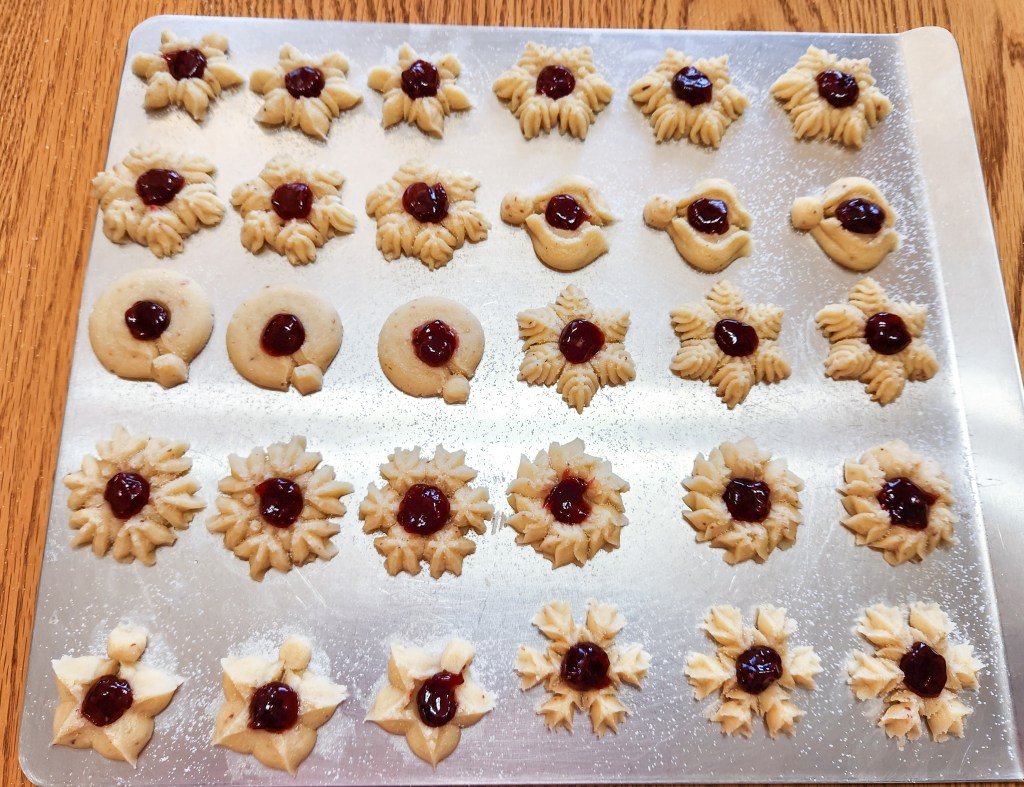 This year they’re plain cookies with no decorating needed, just a thumbprint in the snowflake centers, filled with raspberry pastry filling. Most people use jam, and that would work fine, too, but this stuff is amazing!