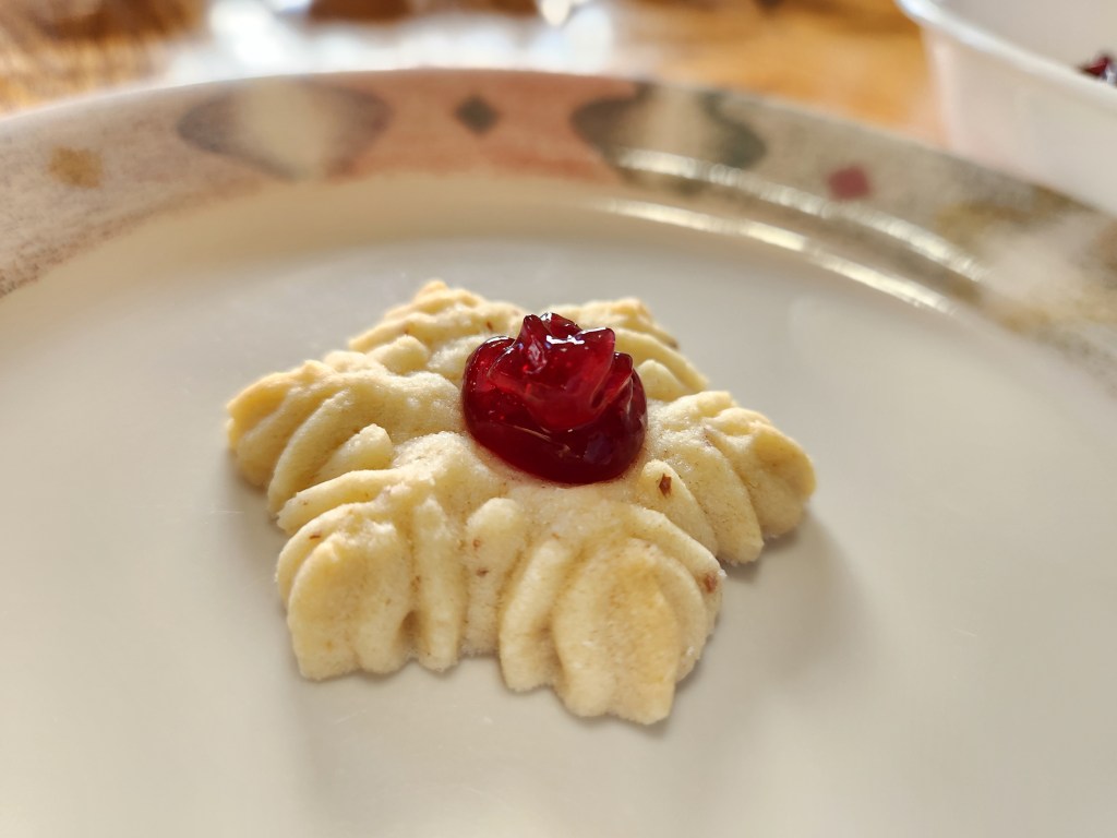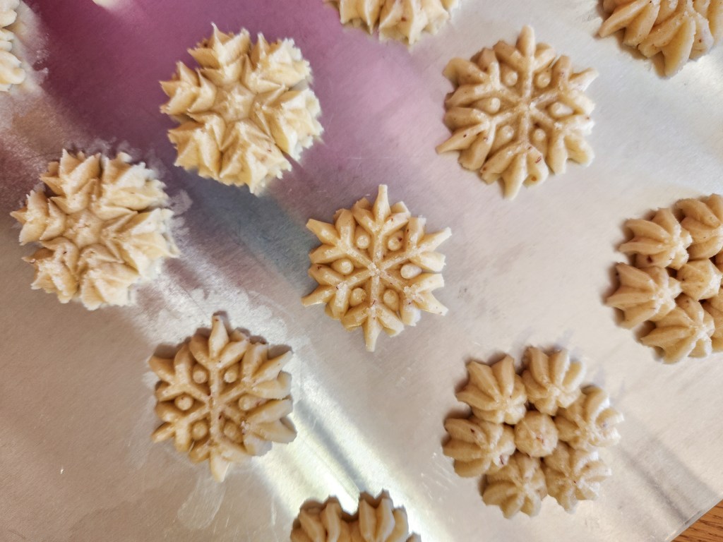 The base cookie is one of my most popular recipes over the years. “Incredibly Almond Spritz Cookies”. (I also give non-almond options.) I created this recipe in 2016 and blogged it as sparkling snowflakes with a pretty white luster dust shimmer.