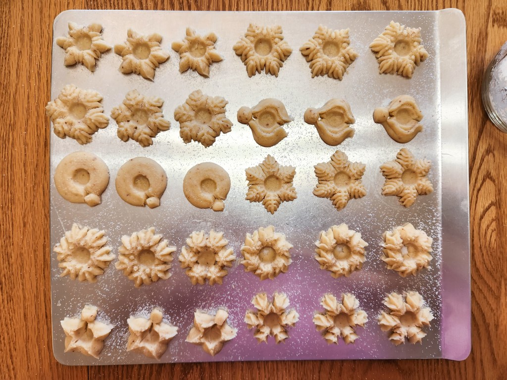 You can always troubleshoot a spritz dough by adding water or vanilla extract a teaspoon at a time to stiff, dry dough, or adding flour a tablespoon at a time to overly sticky or soft dough. Perfect spritz dough has a soft malleable texture that is not too sticky or too stiff.