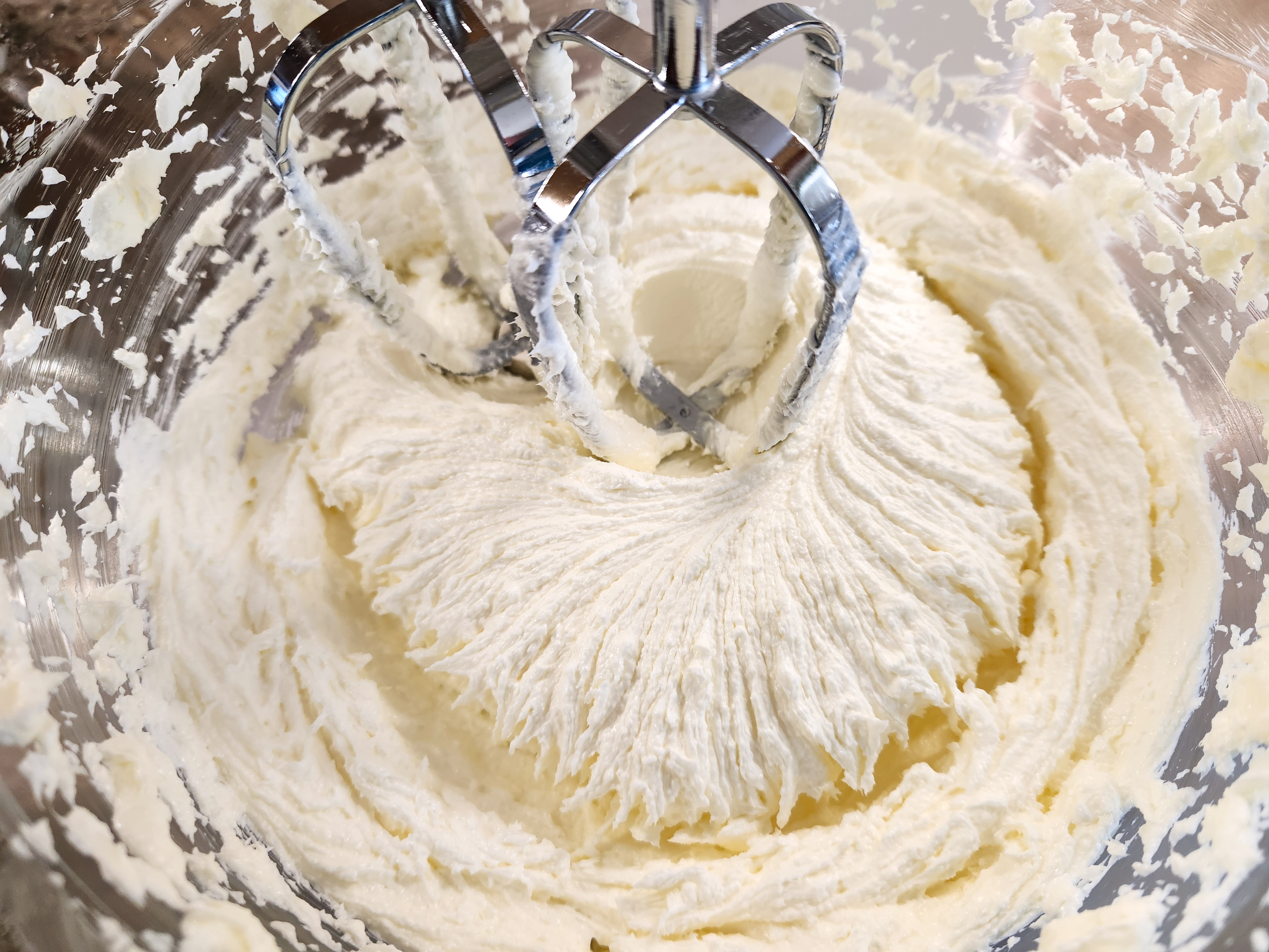Cream the butter well. Perfect spritz cookies begin with super-creamed butter. I use an electric mixer and set it on “whip”. You want seriously fluffy butter. It becomes lighter in color when properly creamed. Next add the sugar and cream it well again.