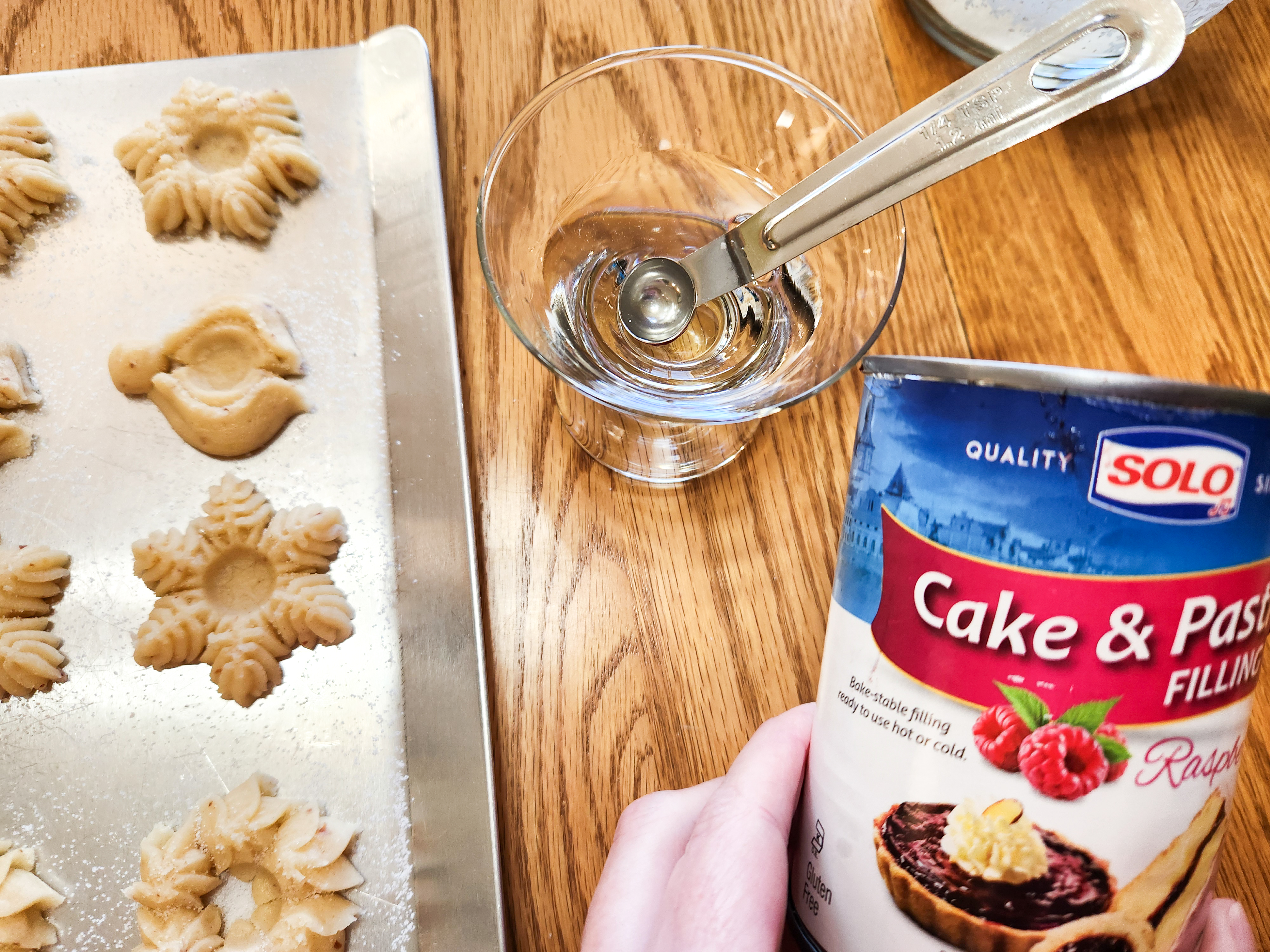 Solo brand cake & Pastry Filling, in Almond and Raspberry flavors. The almond goes IN the dough and the raspberry fills the thumbprints! Search what stores sell it locally for you, or you can always order it online. Totally worth it! Use any extra on toast, waffles, pancakes, ice cream, etc. I am guilty of eating it with a spoon. 🤣
