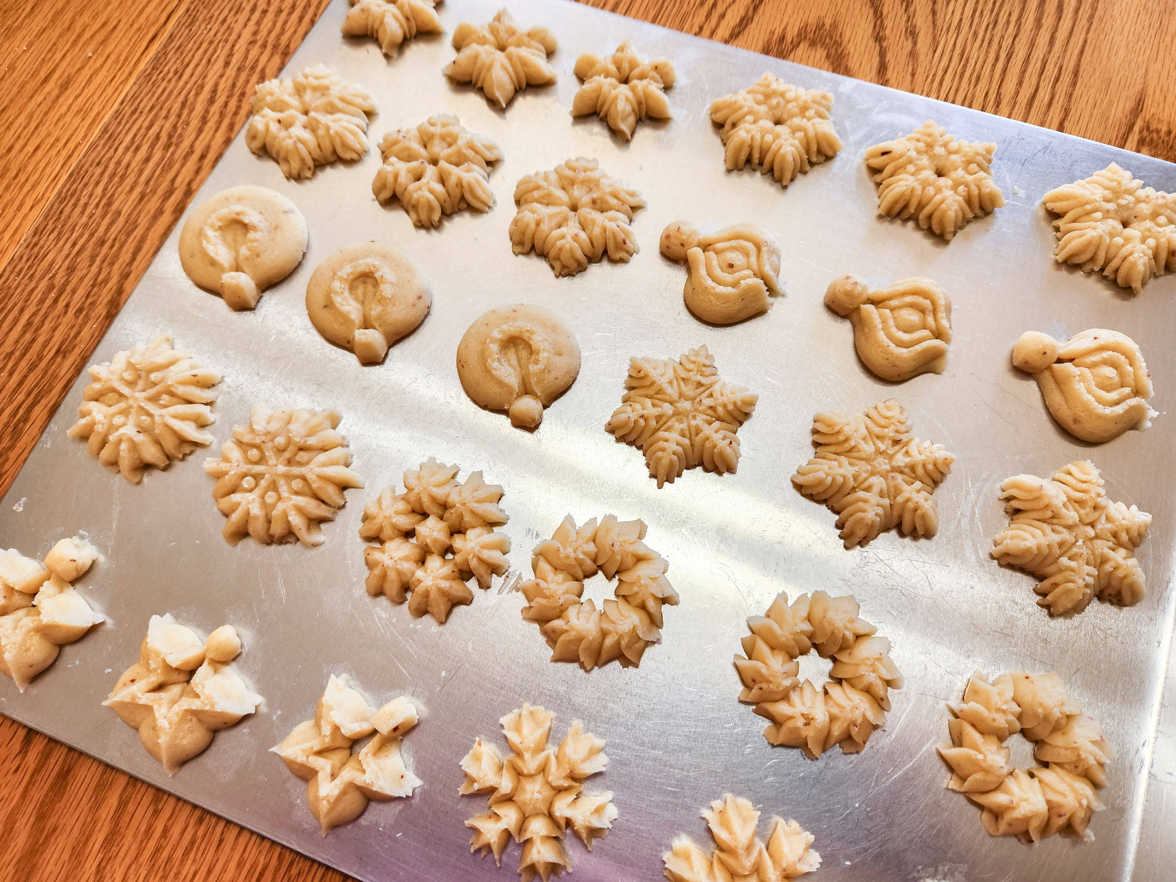 You can always troubleshoot a spritz dough by adding water or vanilla extract a teaspoon at a time to stiff, dry dough, or adding flour a tablespoon at a time to overly sticky or soft dough. Perfect spritz dough has a soft malleable texture that is not too sticky or too stiff.