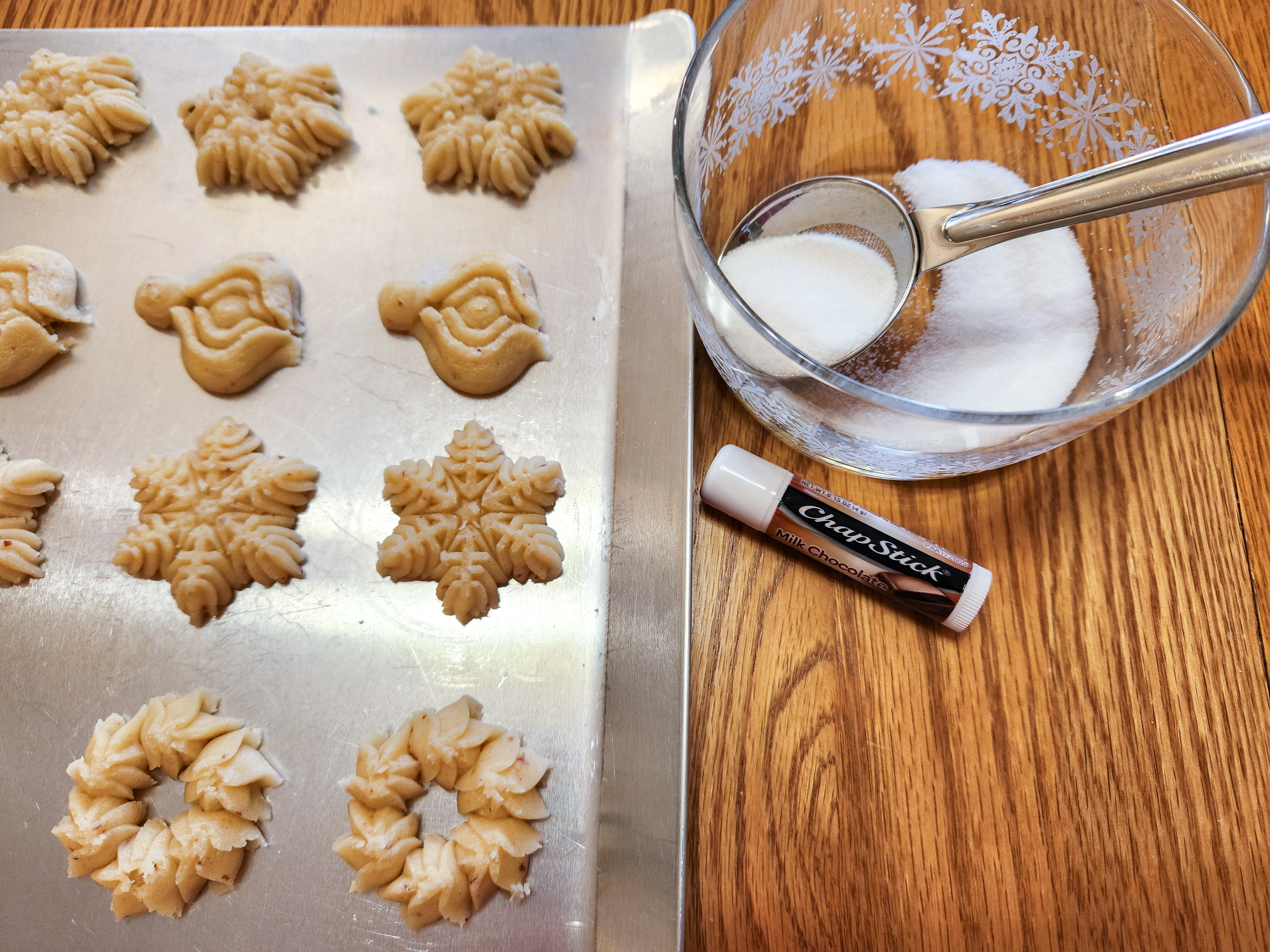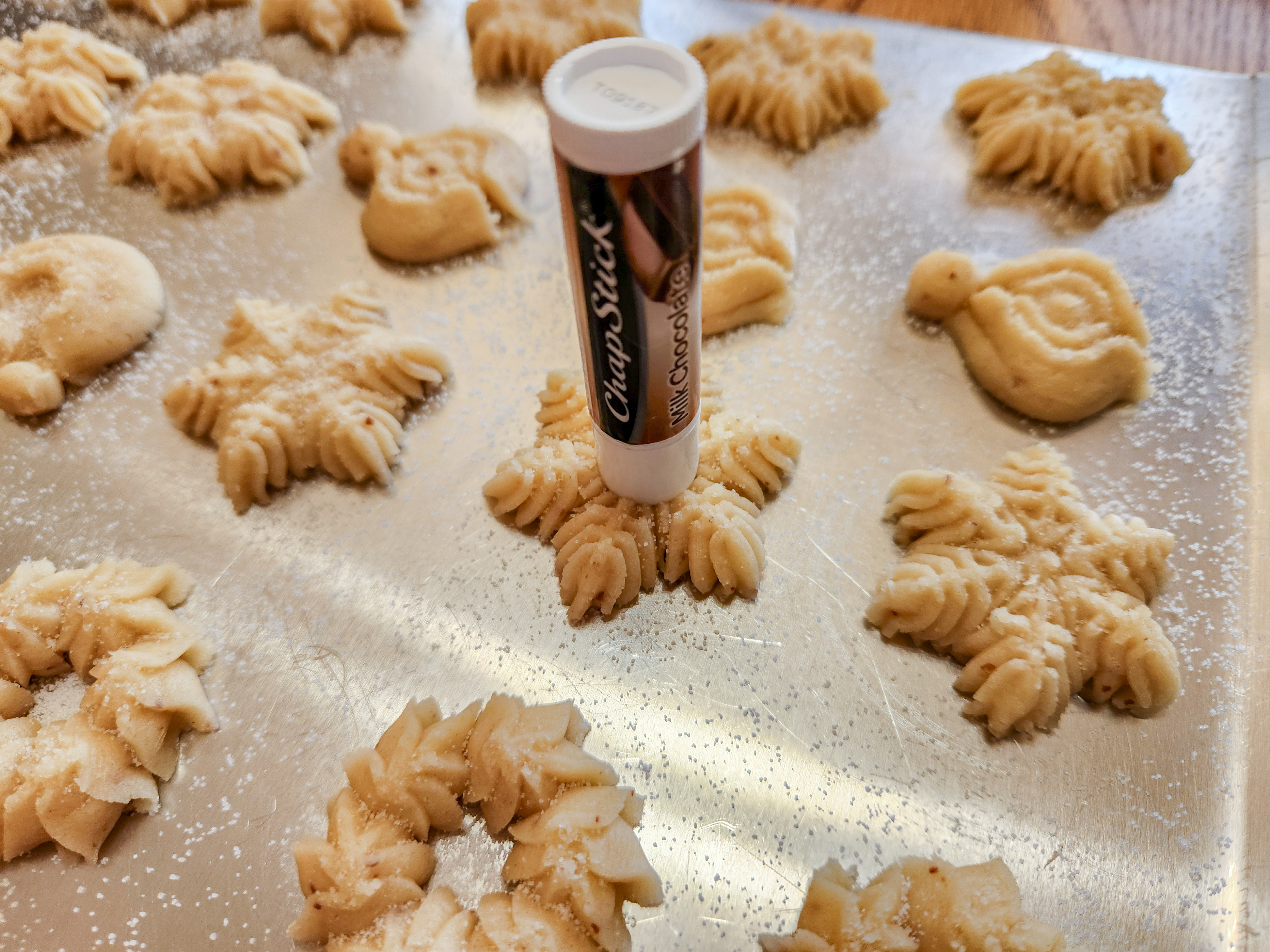 First I used a sifting spoon to sprinkle a little sugar on the tops of the pressed cookie dough. This kept the chap stick top (or thumb) from sticking to the dough. It also adds a sweet pop to the final cookies. 😉