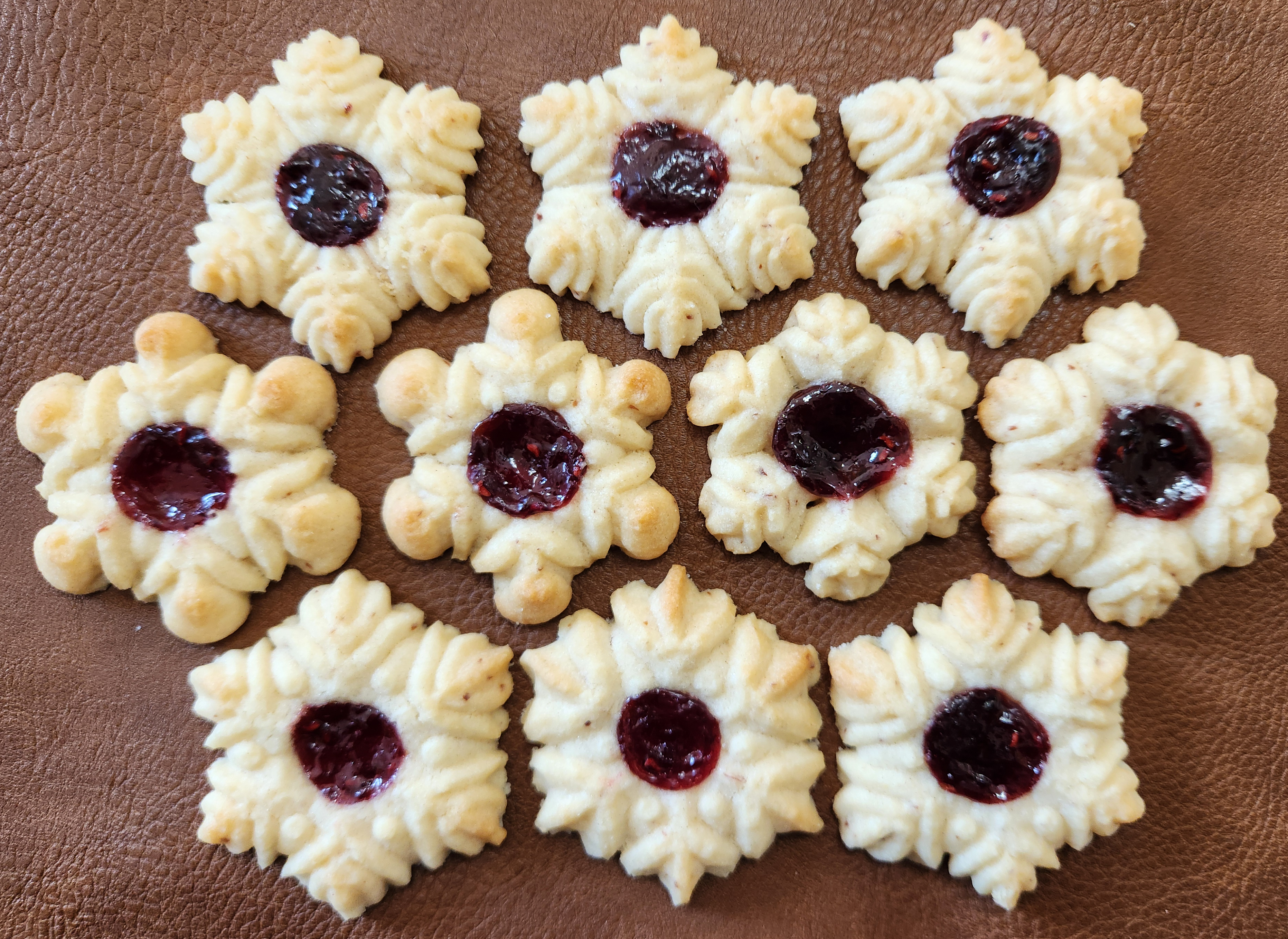 This year they’re plain cookies with no decorating needed, just a thumbprint in the snowflake centers, filled with raspberry pastry filling. Most people use jam, and that would work fine, too, but this stuff is amazing!