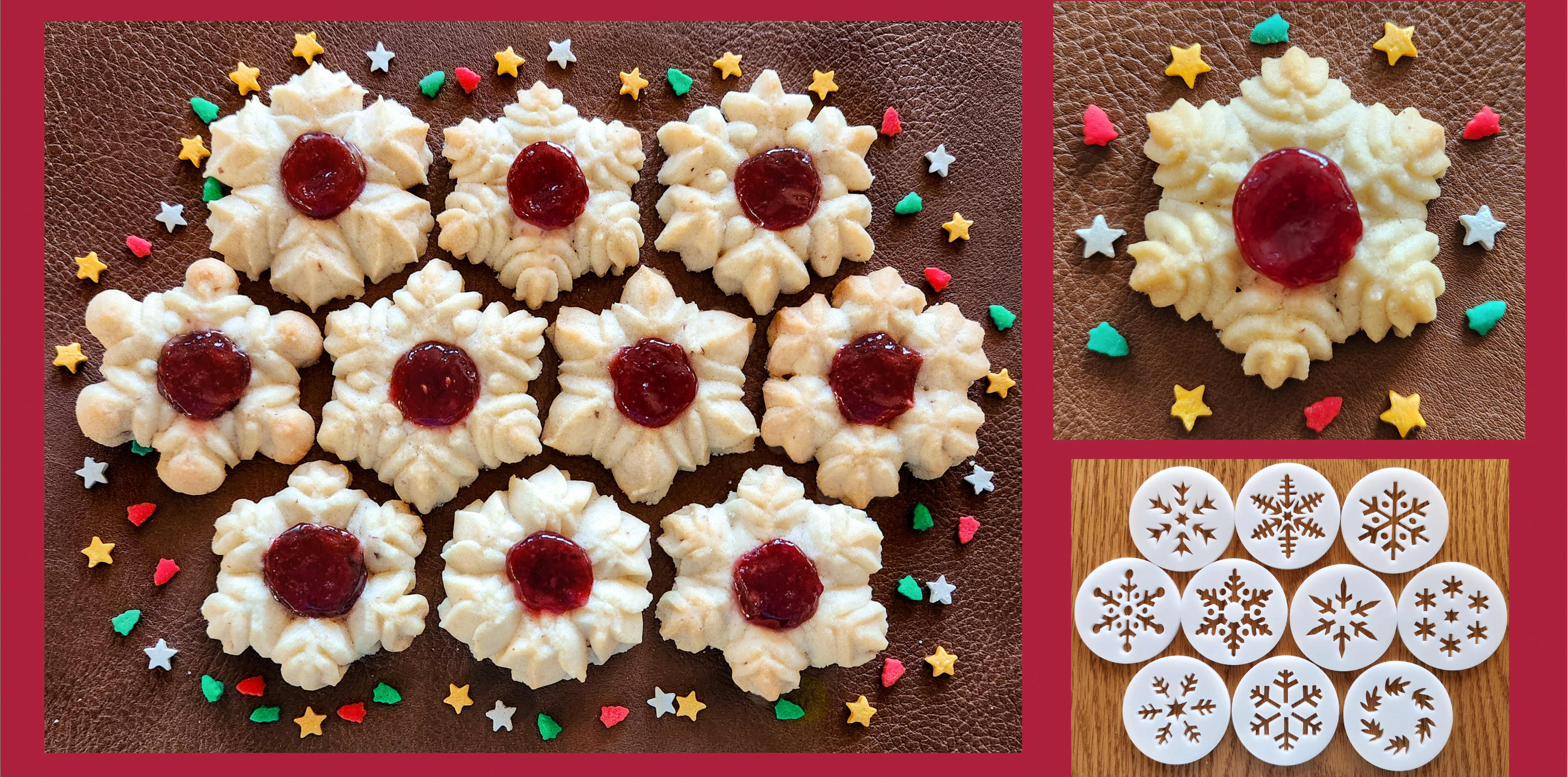 💕Raspberry-Almond thumbprint snowflake spritz cookies! Bake a new kind of thumbprint cookie this year. We have 2 sets of snowflakes disks plus a Christmas wreath and ornaments disks that all make great shapes for thumbprints!💕