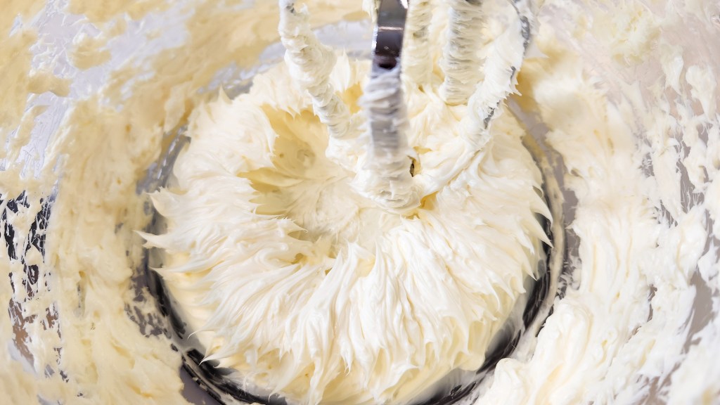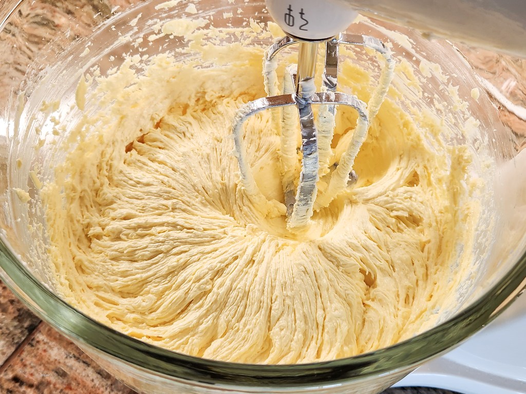 Using an electric mixer, cream the butter very well. I say this in every post so sorry for being repetitive! Creaming your butter until it is fluffy is the key to great spritz cookies. I like to pretend I’m making frosting and use the “whip” setting on my mixer. Butter turns a slightly lighter color when it’s creamed well.