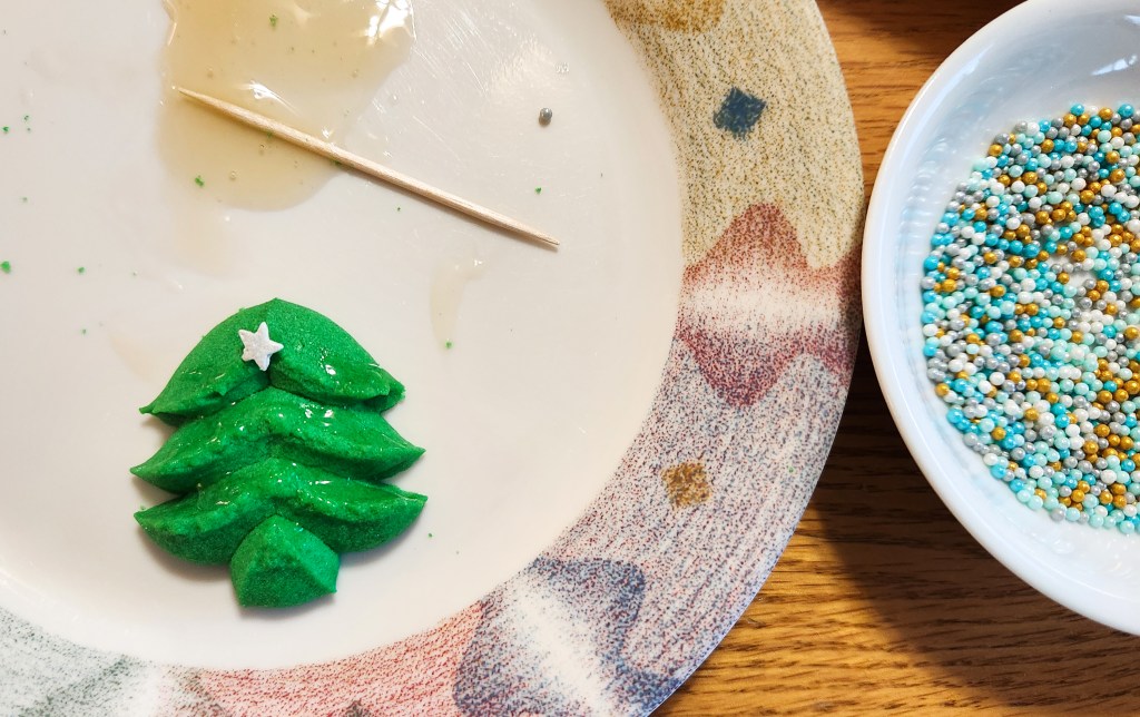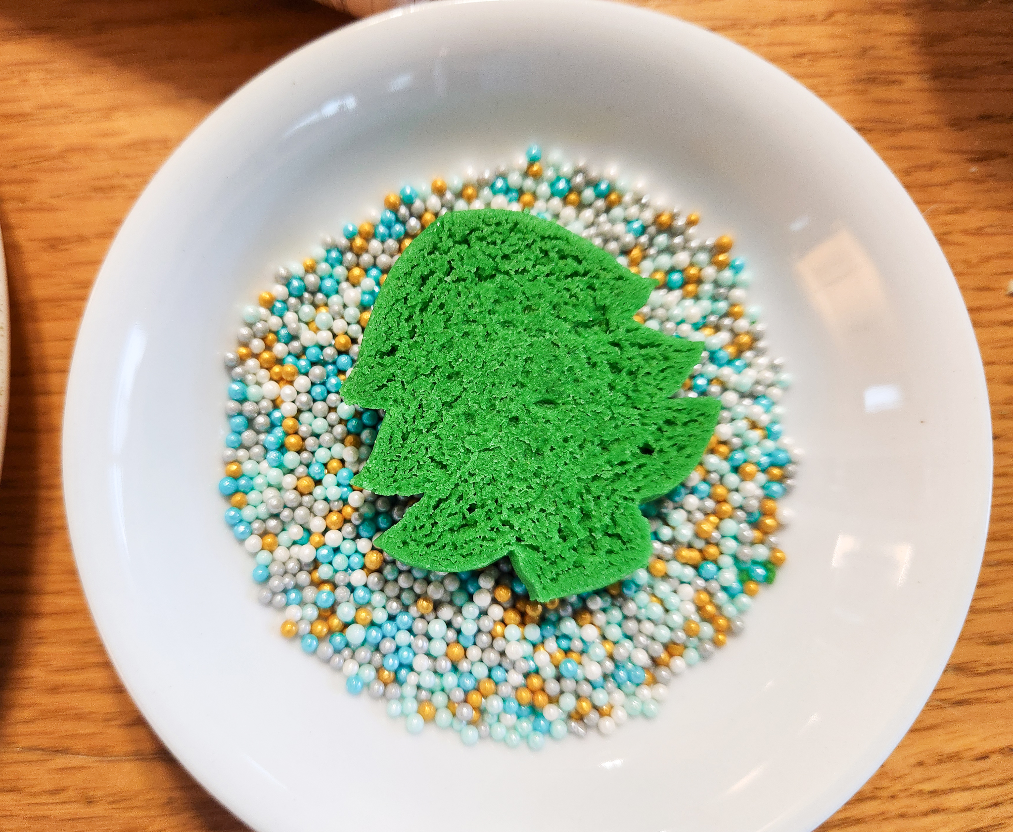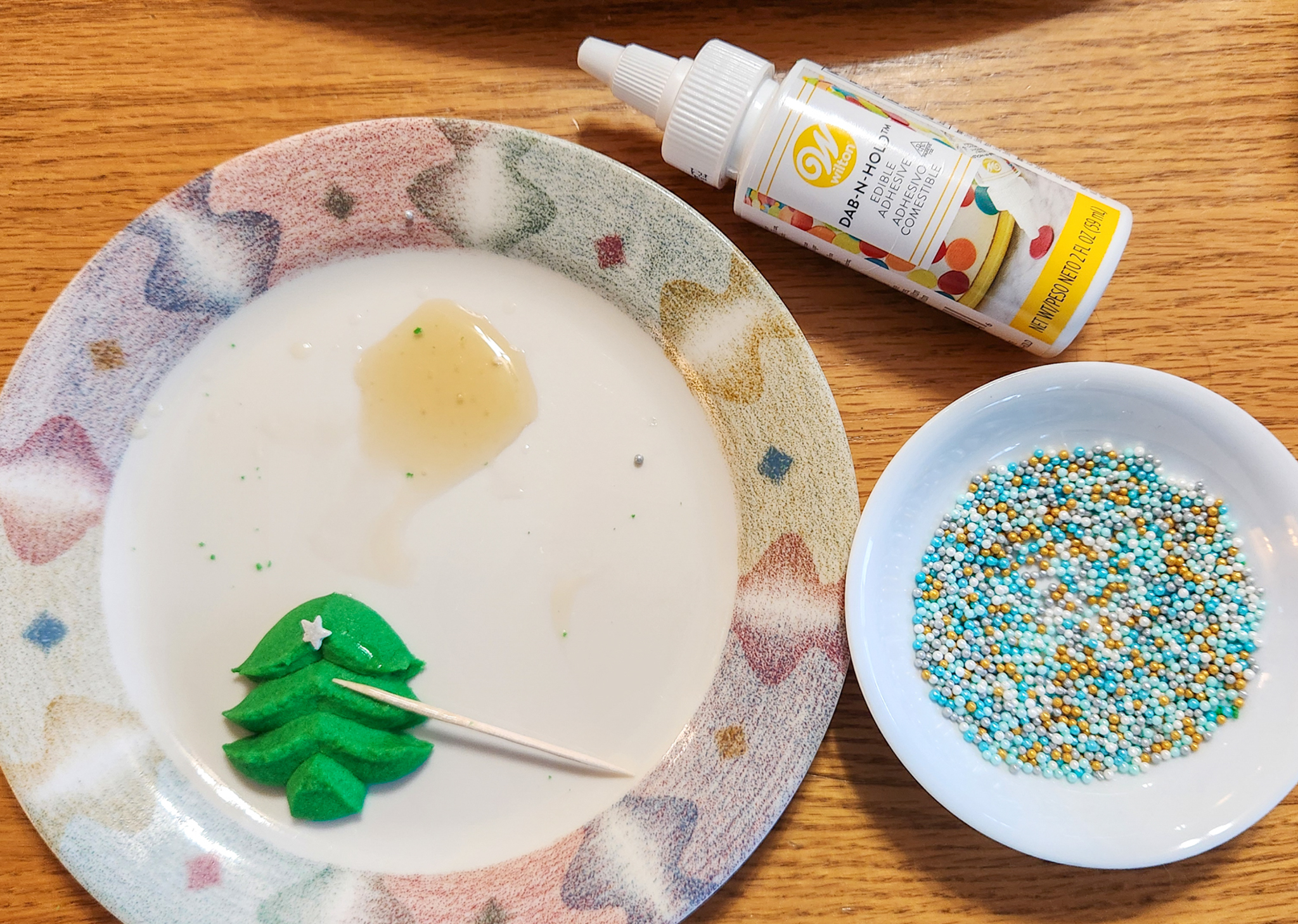 I poured some on a plate and used a toothpick or decorating brush to apply glue to the trees. I put the nonpareils (colorful little balls) into a small dish and turned the trees with glue upside-down into the nonpareils. Push it around a little till they stick. You can re-insert any tree parts that didnt stick at first. Rearrange any decors around as you like! Sometimes they go on perfectly, sometimes you have to give ’em a little nudge.