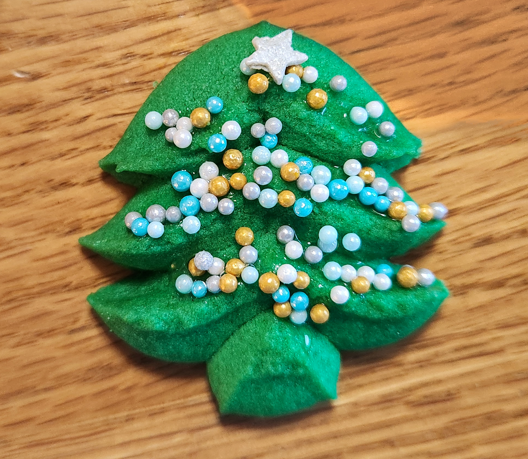 The only decorating I did was to add sprinkles/nonpareils to the trees. You CAN add decorations before baking, I just decided to use sugar glue this time. They’re both great options! To add before baking just sprinkle or hand-place decors onto the pressed shapes, pushing in slightly so they stay put. For gluing after baking, use either icing (honestly any regular icing will do, even from a tube) or I like to use Wilton’s Dab-n-Hold. it’s a pretty good sugar glue!