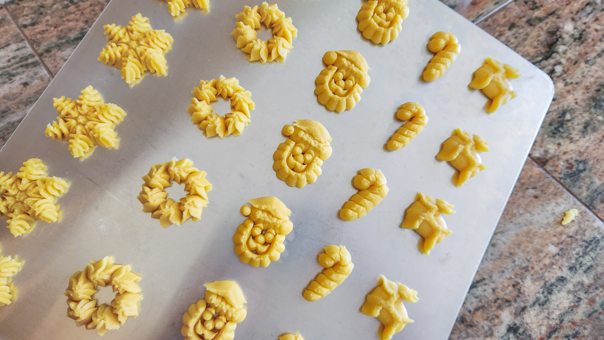 If you’re wondering why I used cake batter flavor instead of cake mix, the leavening in cake mix is too much for spritz cookies. The flavoring was a much better way to go! The flavoring is a bit syrupy, though, so this recipe has less honey and more flour than my usual recipes. Please adjust as needed to get that correct spritz texture! It should feel like fun workable clay and not stick to your fingers!