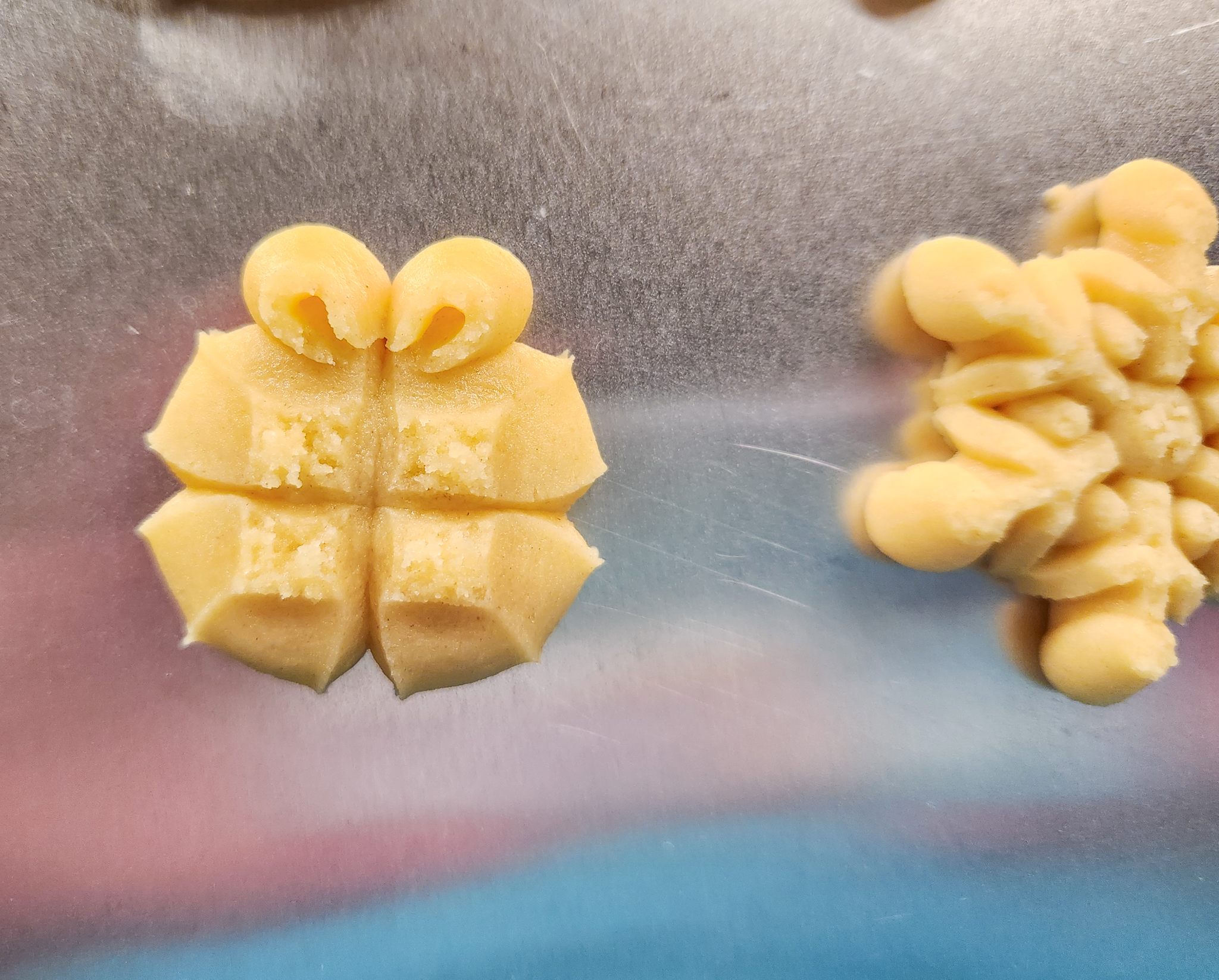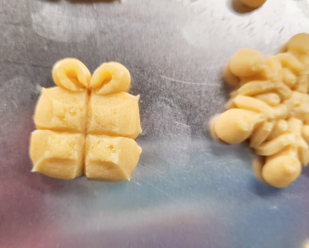 If you press the Gift shape from the Christmas set, straighten the edges after pressing, using your finigers to simply push the sides and botton inward until straight. It just takes a second. All squar-ish shapes press like this just because of the physics of extruding dough. It takes a quick second to fix. 😉