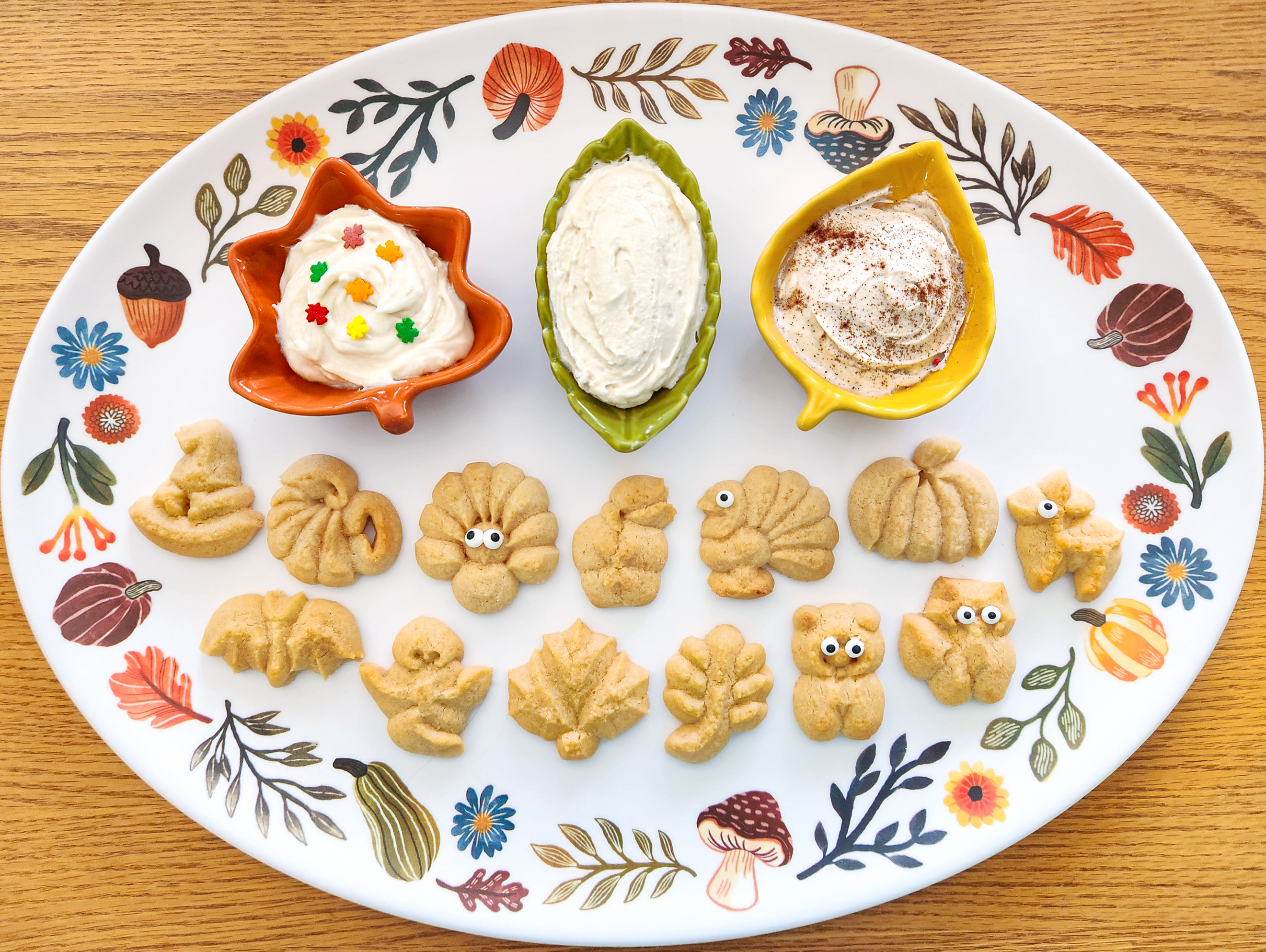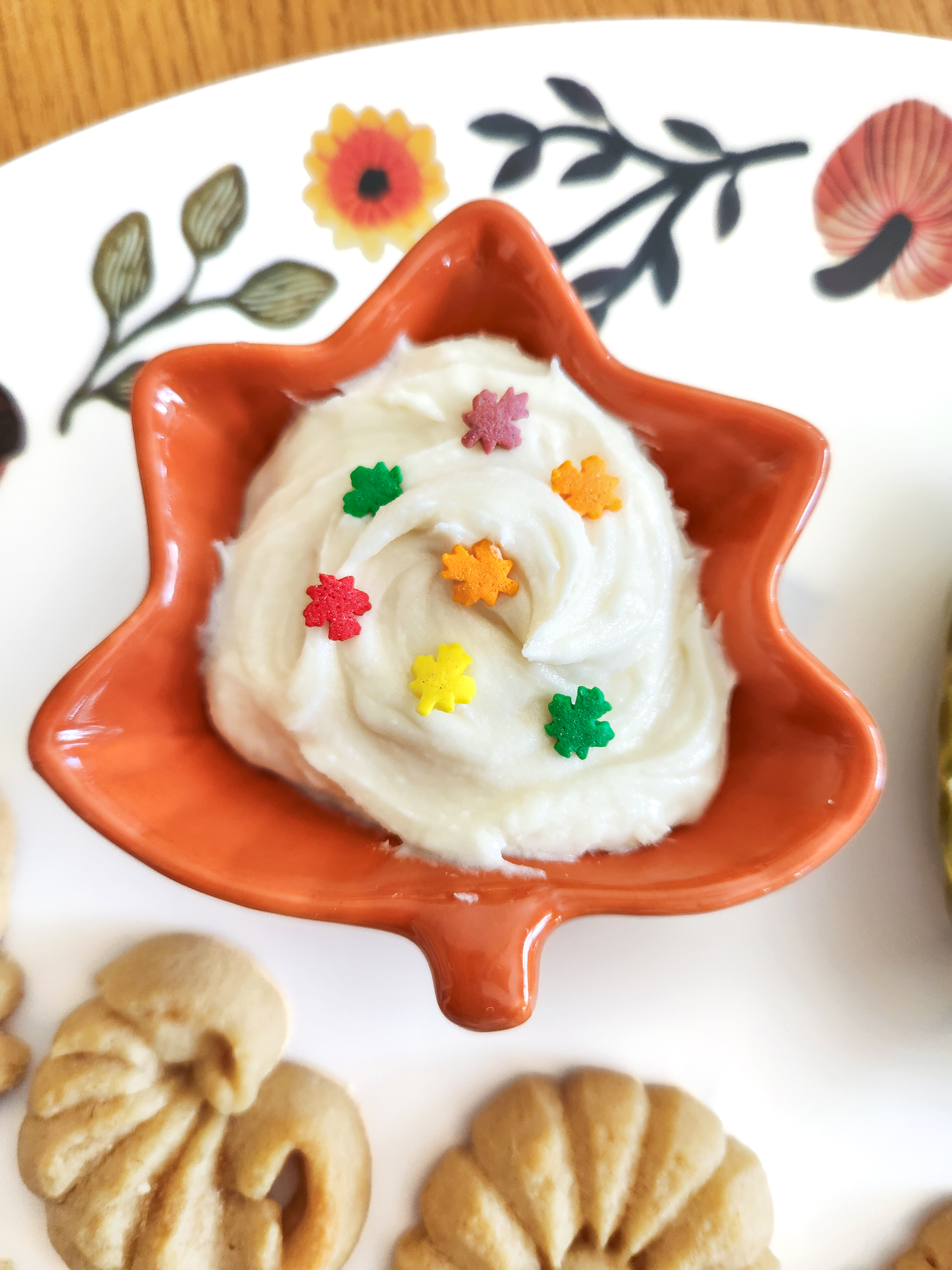 I left one portion plain vanilla, another I added cinnamon to (just add as much as tastes good to you), and I added fall leaf sprinkles to the third. Get creative and add whatever makes you happy. In my original Veggies & Dip post I added orange and green sanding sugars to make it look like ranch dip. Try adding jimmies, nonpareils, colored sanding sugars, and cute sprinkles. 😂 My favorite with the apple cider cookies is definitely the cinnamon version. It complements so well!