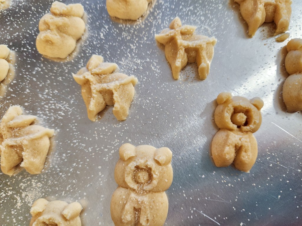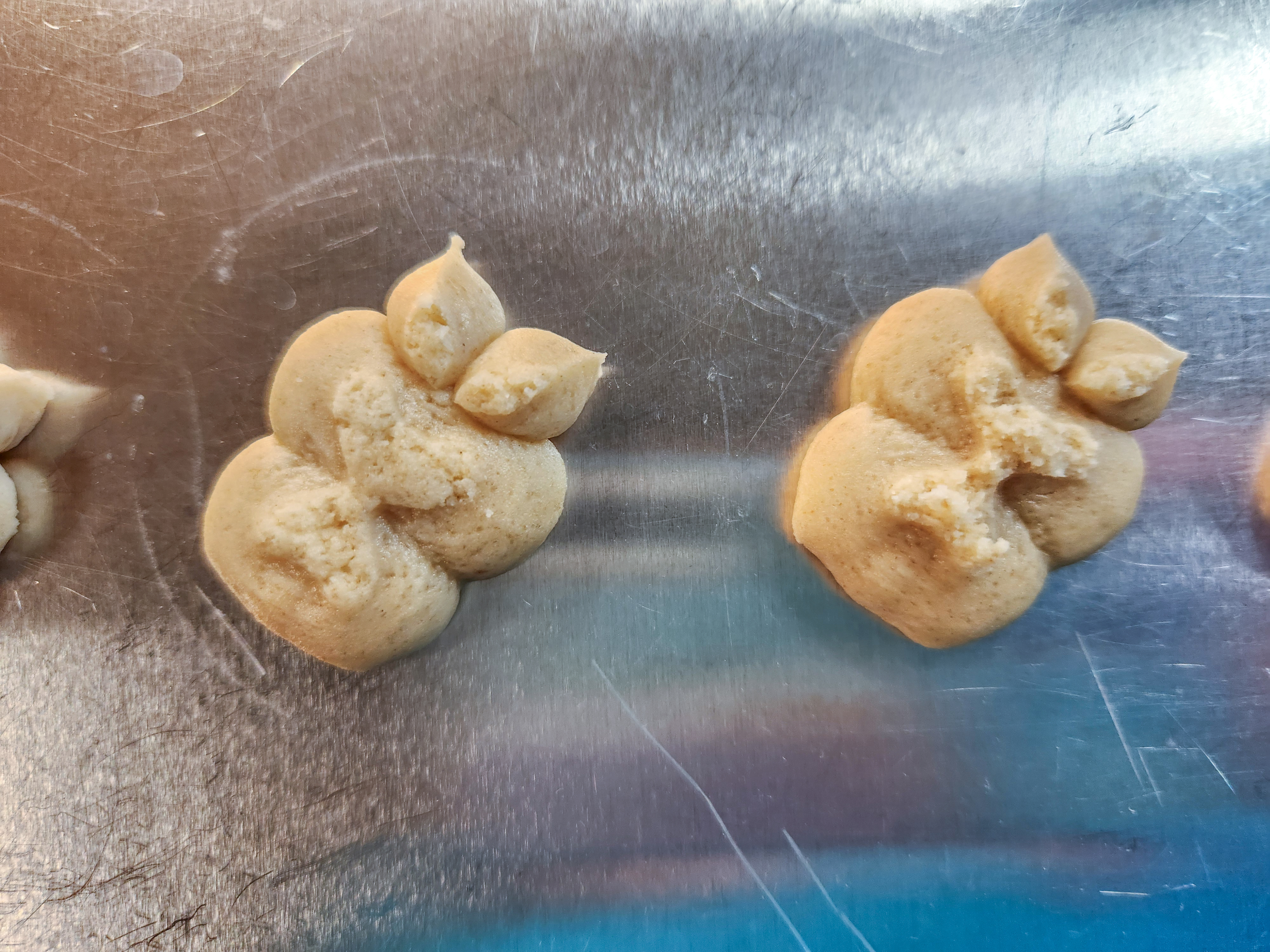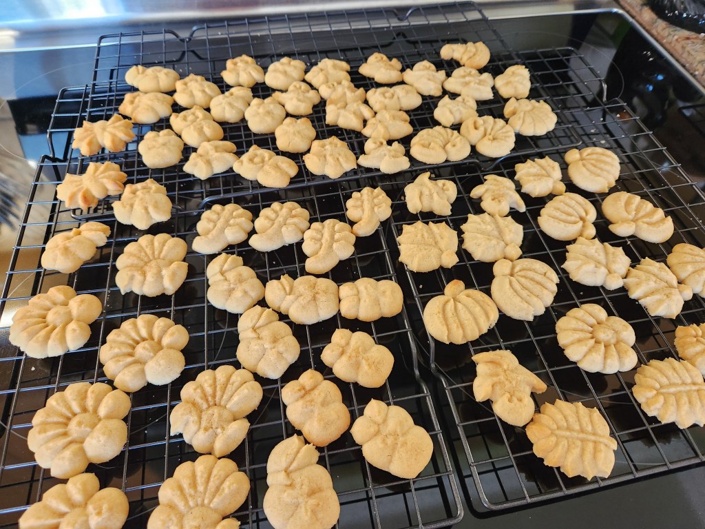 Remember, small cookies bake faster and large cookies take longer. Keep that in mind when pressing. Group like sizes together if you can to avoid burned or under-baked cookies. Do NOT overbake this recipe! Once they puff up, look dry and not shiny, and start to crackle a bit on top they are done. These don’t have to brown much, just puff up and have that dry “set” look. They get crunchy when you bake them longer. Honestly, we all preferred them just barely done.