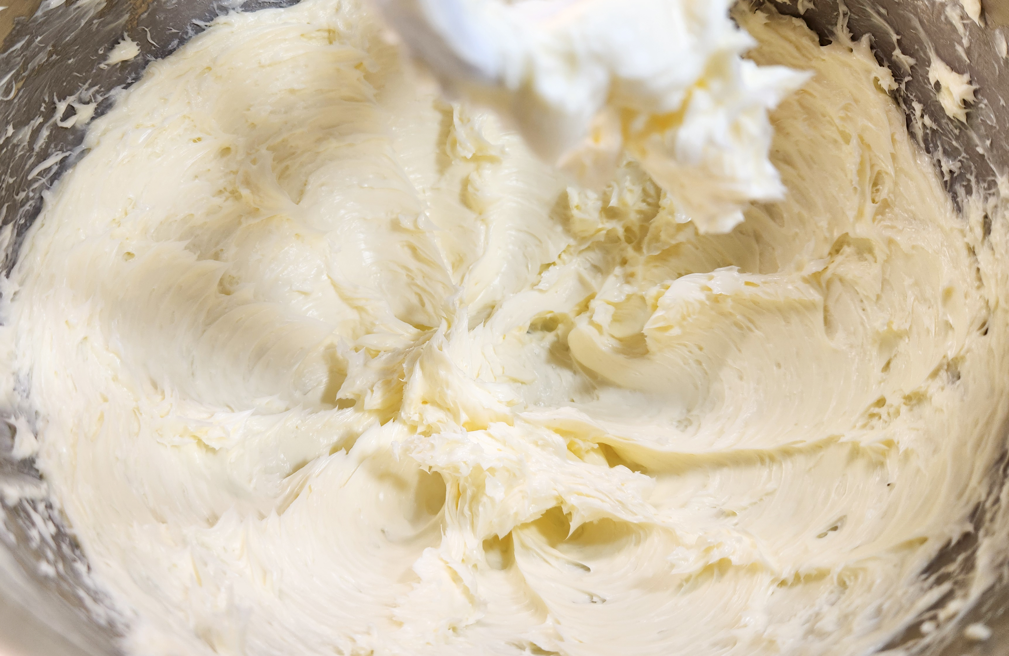 Using an electric mixer, cream the butter very well. I say this in every post so sorry for being repetitive! Creaming your butter until it is fluffy is the key to great spritz cookies. I like to pretend I’m making frosting and use the highest setting on my mixer. Butter turns a slightly lighter color when it’s creamed well.