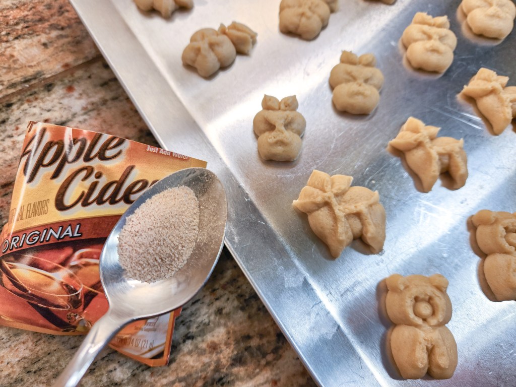 Once your cookies are pressed, sprinkle the tops with the cider powder to give them a nice flavor pop. Just tap it off of the edge of a spoon.
