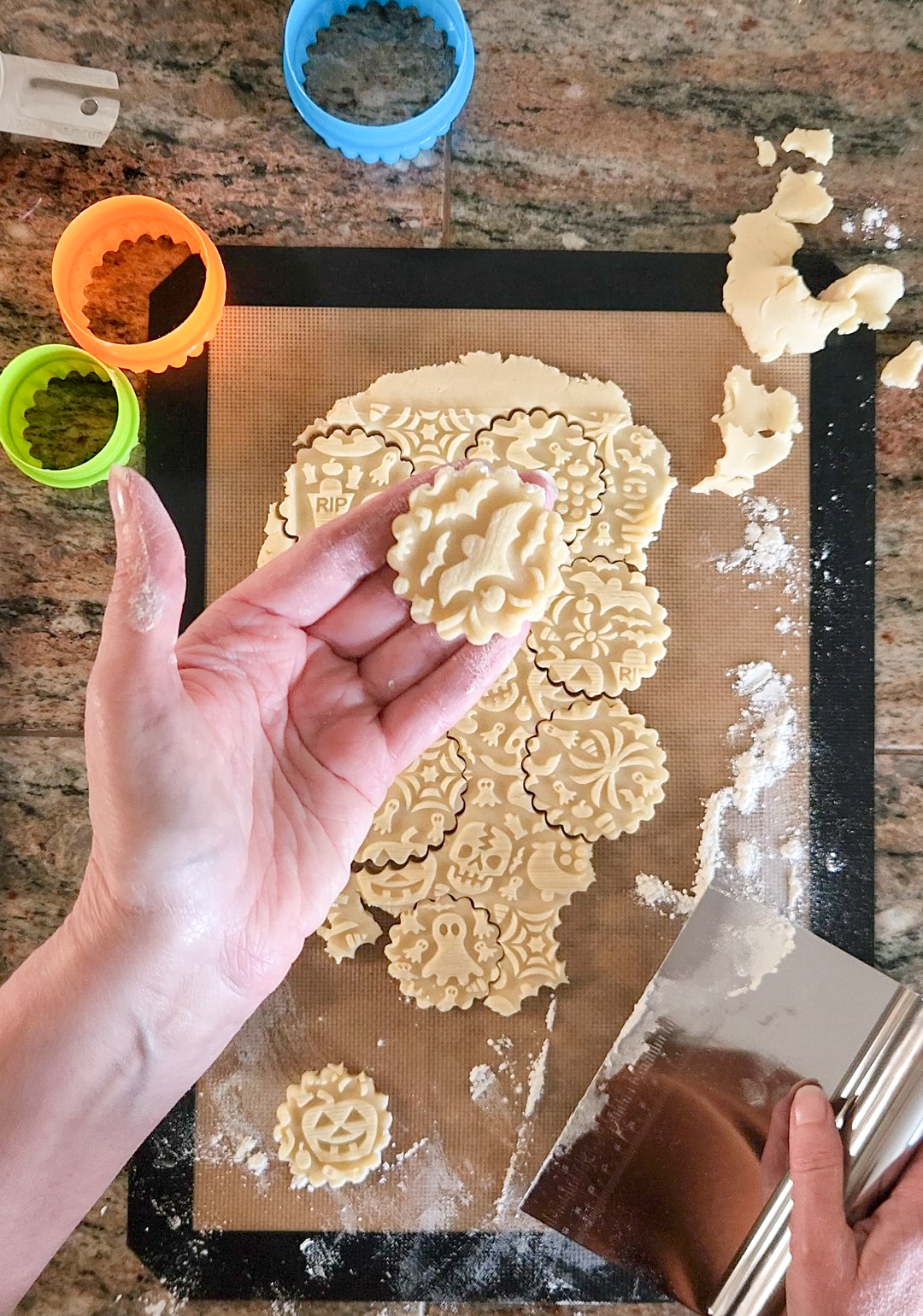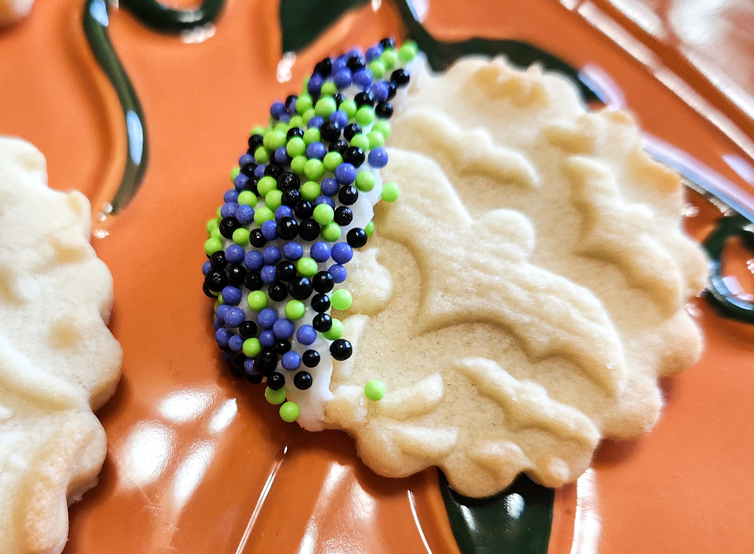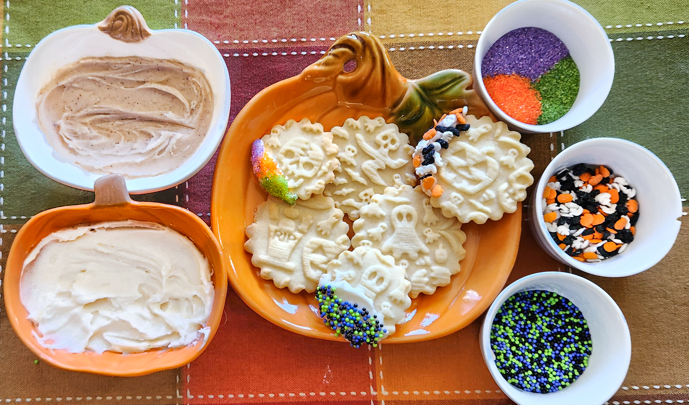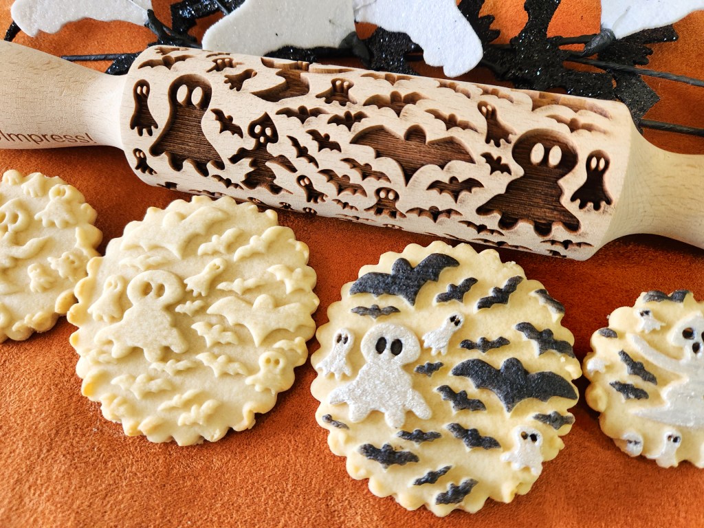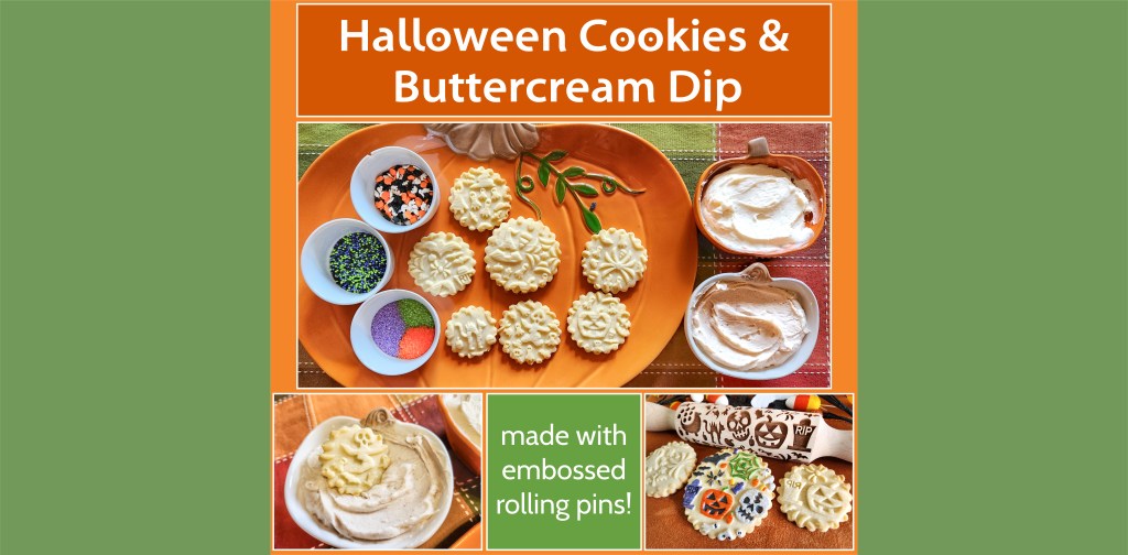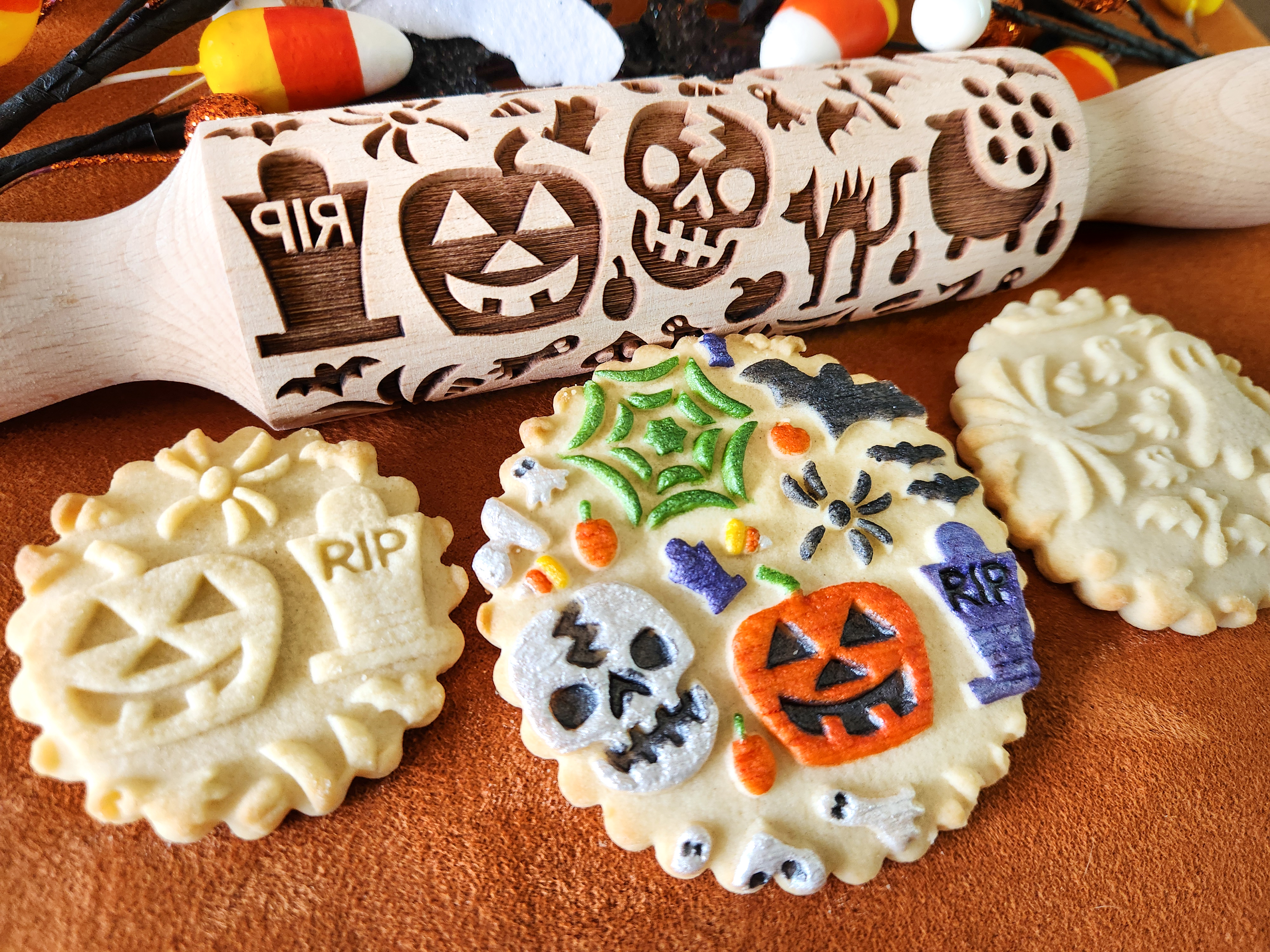 For the cookies in this post I’m using two of our embossed rolling pins: Halloween Large Designs and Spooky Skies. They’re shown painted with edible luster dust below, but I left the cookies plain for this post. If you want to paint them, I have many posts on this blog with tutorials. Check out last year’s Pumpkin Spice Sandwich Cookies that I did will my Fall Leaves Large Designs pin. That post has an easy but thorough painting tutorial! It’s super fun! https://creativecookiepress.com/2024/09/28/pumpkin-spice-sandwich-cookies/