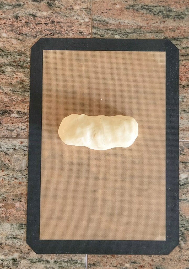 If using an oiled pin instead of waxed paper, place a bench scraper or similar item at the far end of the dough to prevent it from pulling up as you roll. See pictures below with embossed pin. Use a regular rolling pin (preferably one with thickness spacer rings to make a perfect thickness) to roll your dough on to a silicone baking mat, glass cooktop, or lightly floured surface. Roll to a 1/4” thickness, and wide enough to accommodate the designed pin. Create a long rectangular slab of dough. The patterns on the embossed pins are designed to repeat, so you will be rolling a long rectangle of patterned dough.