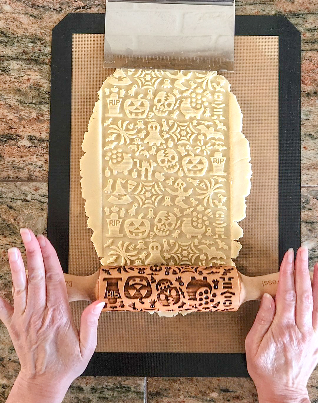 Place a bench scraper or similar item at the far end of the dough to prevent it from pulling up as you roll. Now roll with your embossed pin, pressing down with a steady pressure that leaves a deep impression in the dough. The designs should be as raised up on the dough as deep as they are in the pin. If the pattern is not deep enough it will disappear as the cookies bake and puff. As this dough is not cold or stiff, you do not have to press terribly hard! Just an even pressure.