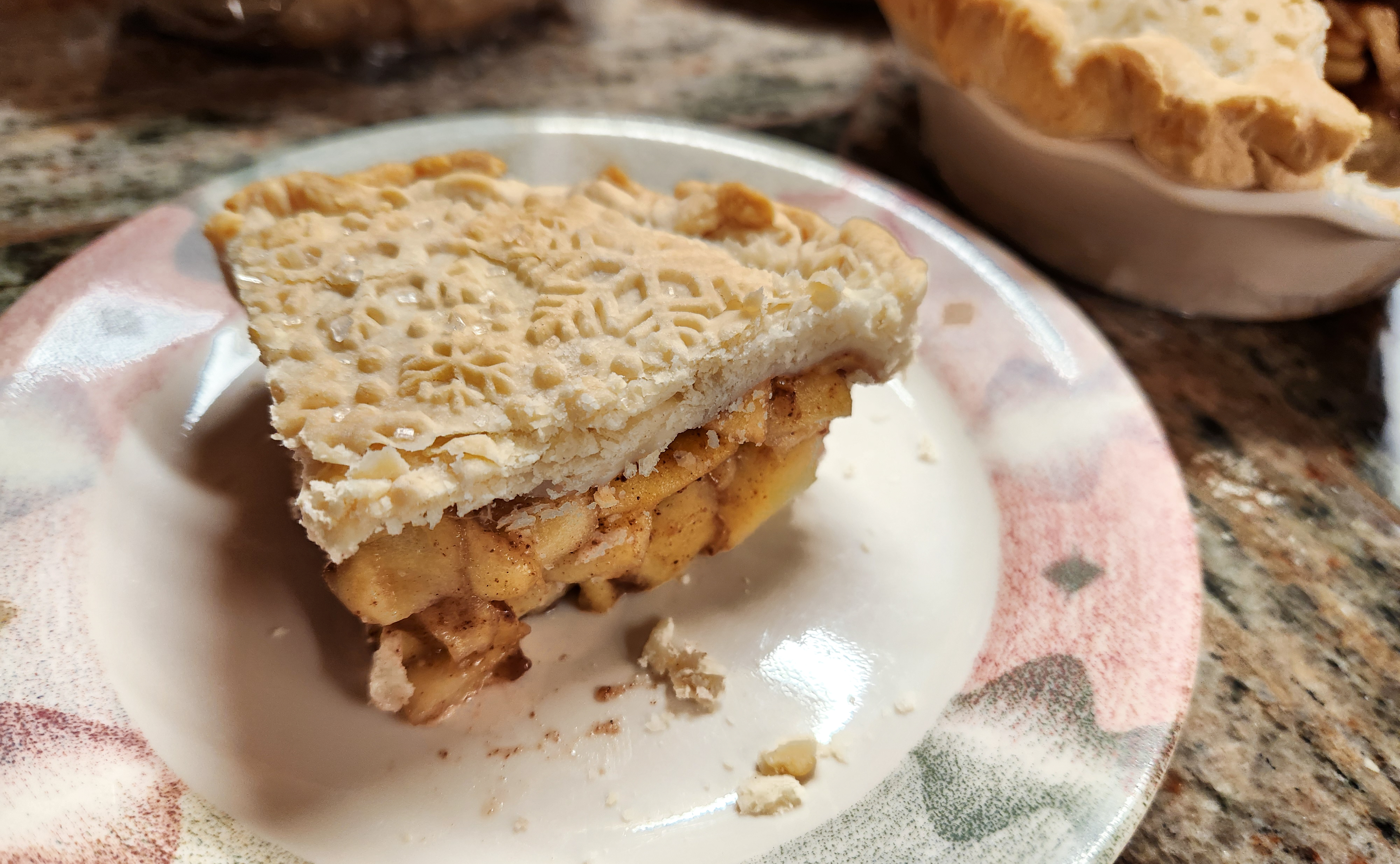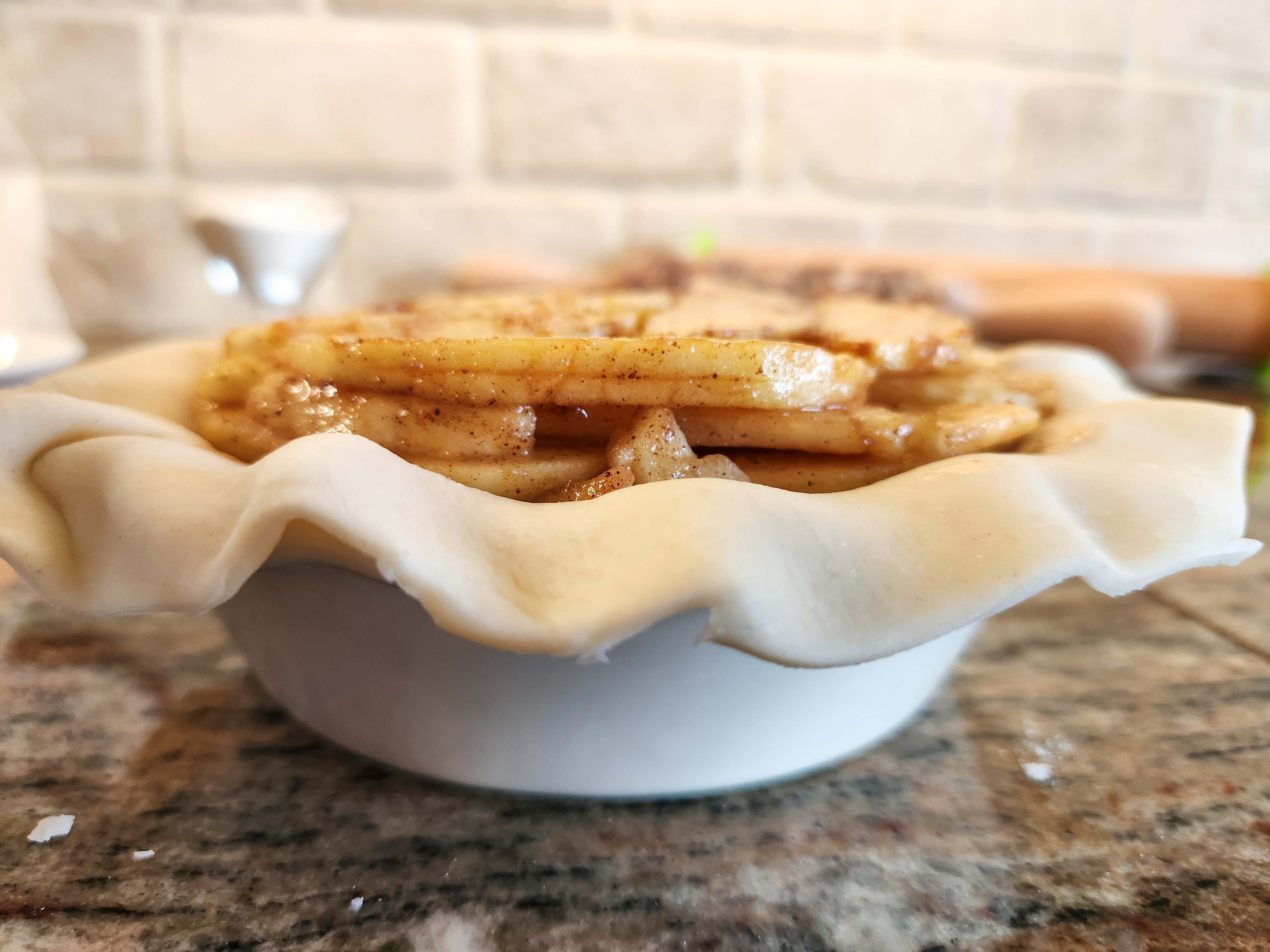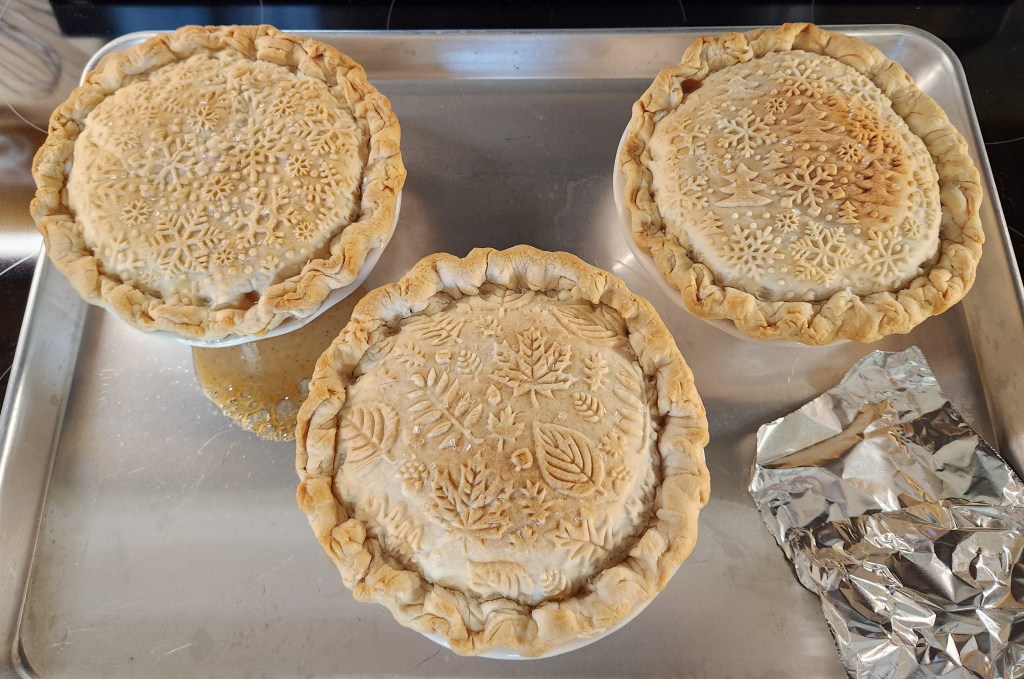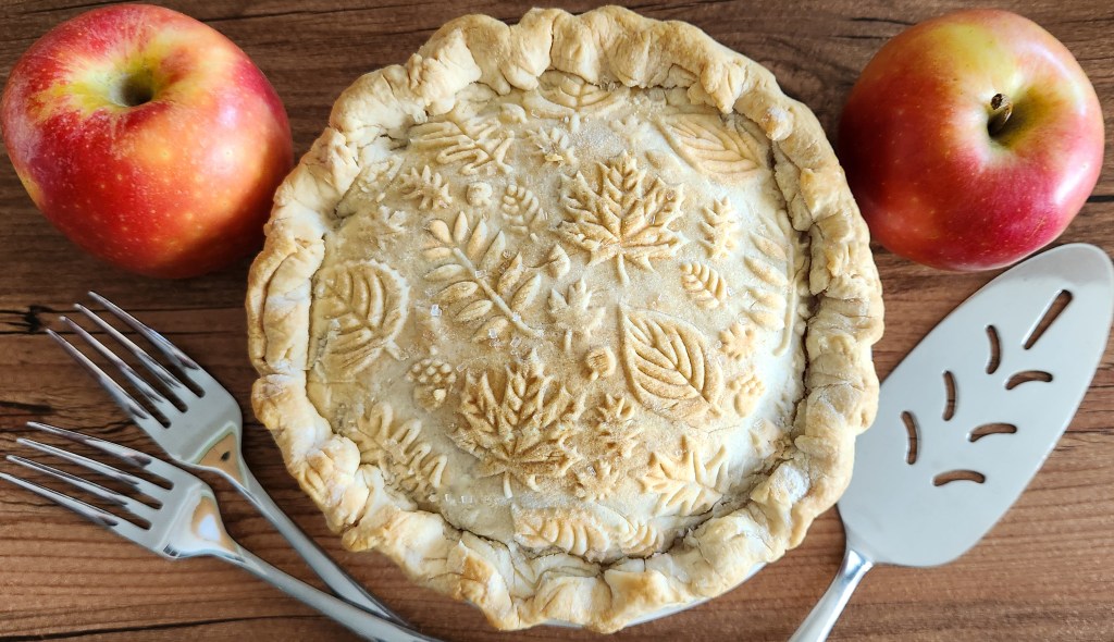 Mini pies are becoming super popular, especially for individual servings and small gatherings. But here’s some reasons why they are also wonderful for larger groups. Small pies are simply adorable! Many people love the crust-to-filling ratio. Variety! You can make multiple small pies with different flavors to share. Some people make them as personal pies or for just two people. We found that we could get 3 slices out of the 6” pies when we piled the apples high! I love that I can emboss the tops in several patterns just for the festive beauty of it.