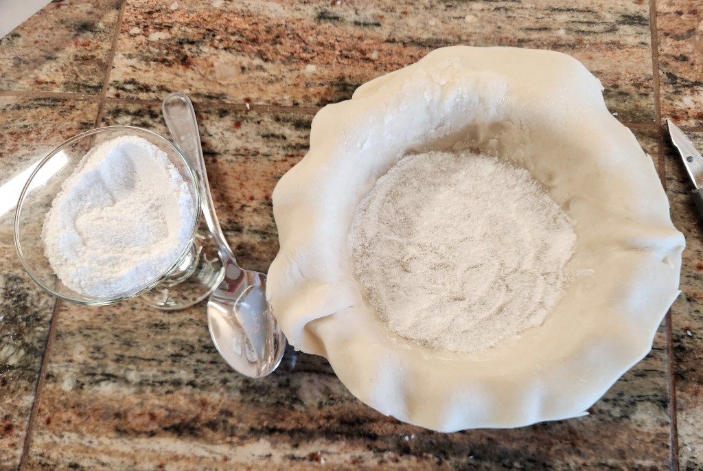 Now place a crust round into the bottom of your first pie dish. Use shortening or butter to grease the bottom of the dish to prevent sticking. You won’t need the full big round of dough, so use your fingers to press it into the pan and cut away the excess with a knife or kitchen shears. Then sprinkle enough of your “crust dust” mixture (mix the sugar and flour together) on the top of this bottom crust. It helps keep the crust from getting soggy.