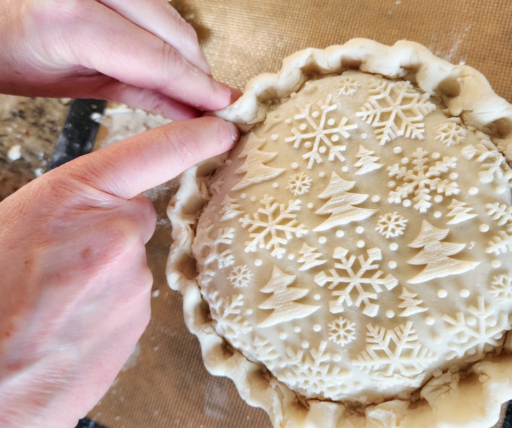 Now flute the edges by placing a knuckle or fingertip on the inside edge of this crust ring, while pinching your finger from the outside of the ring. This creates a lovely wavy pattern along the edge. Here I did that with the Snowflakes & Woodland Pine Trees embossed pie.