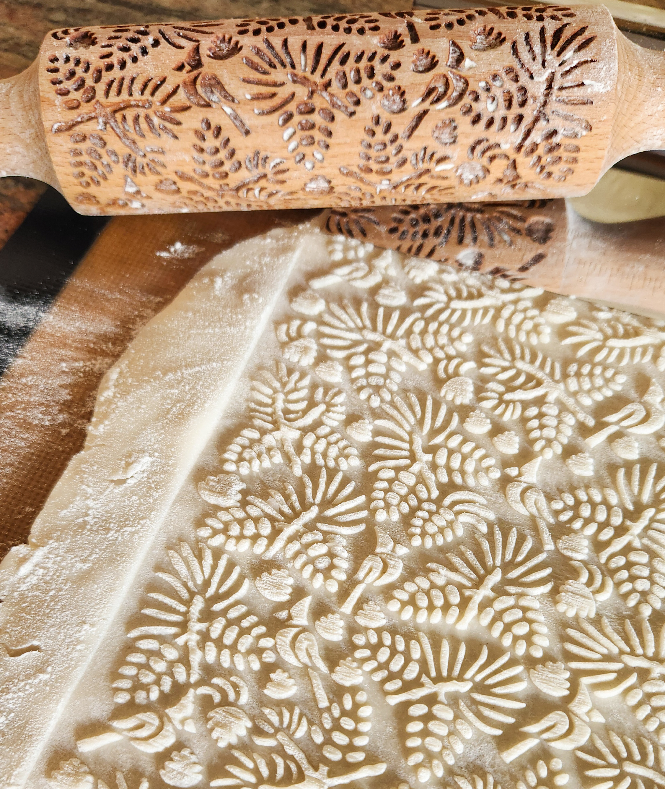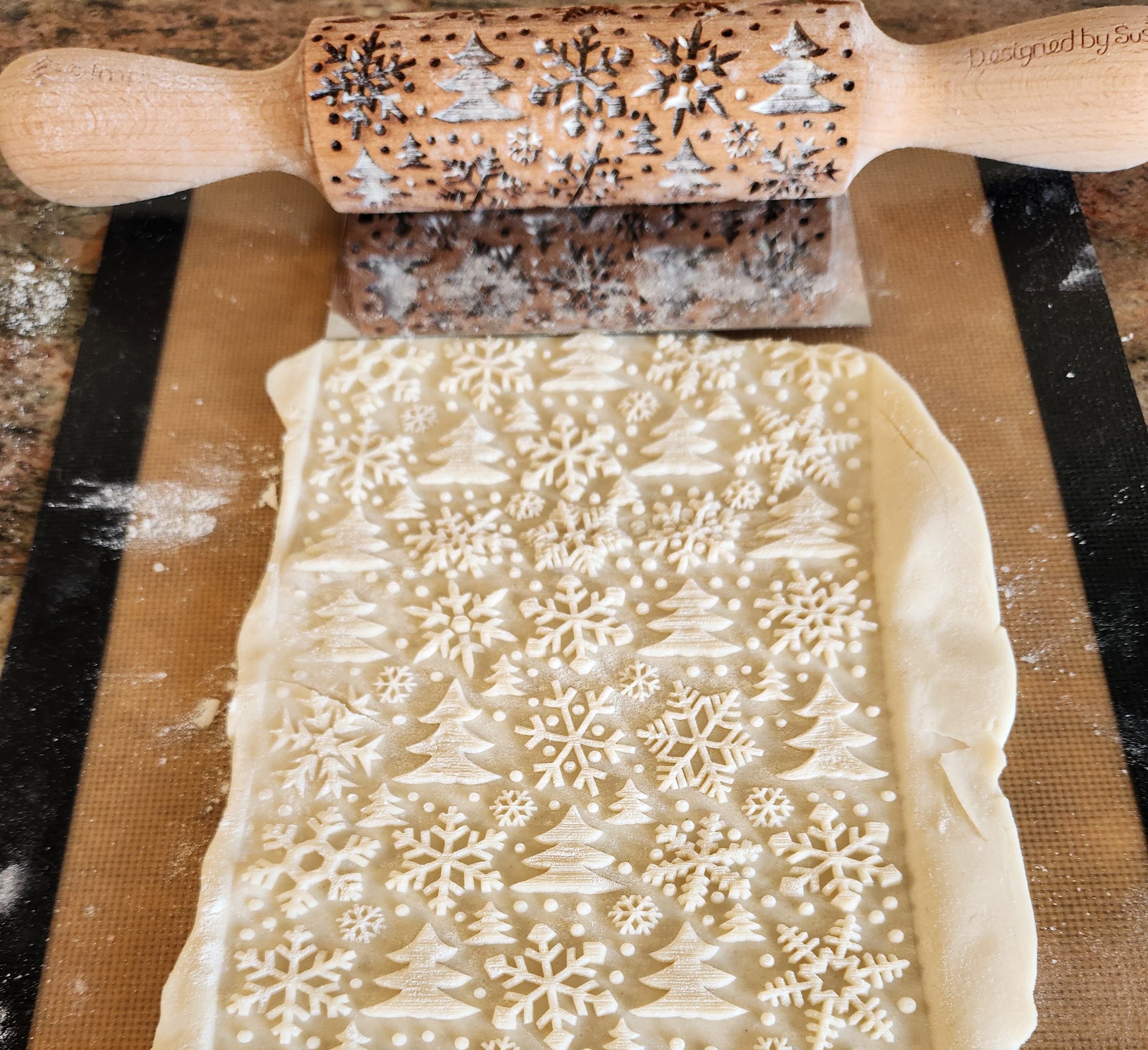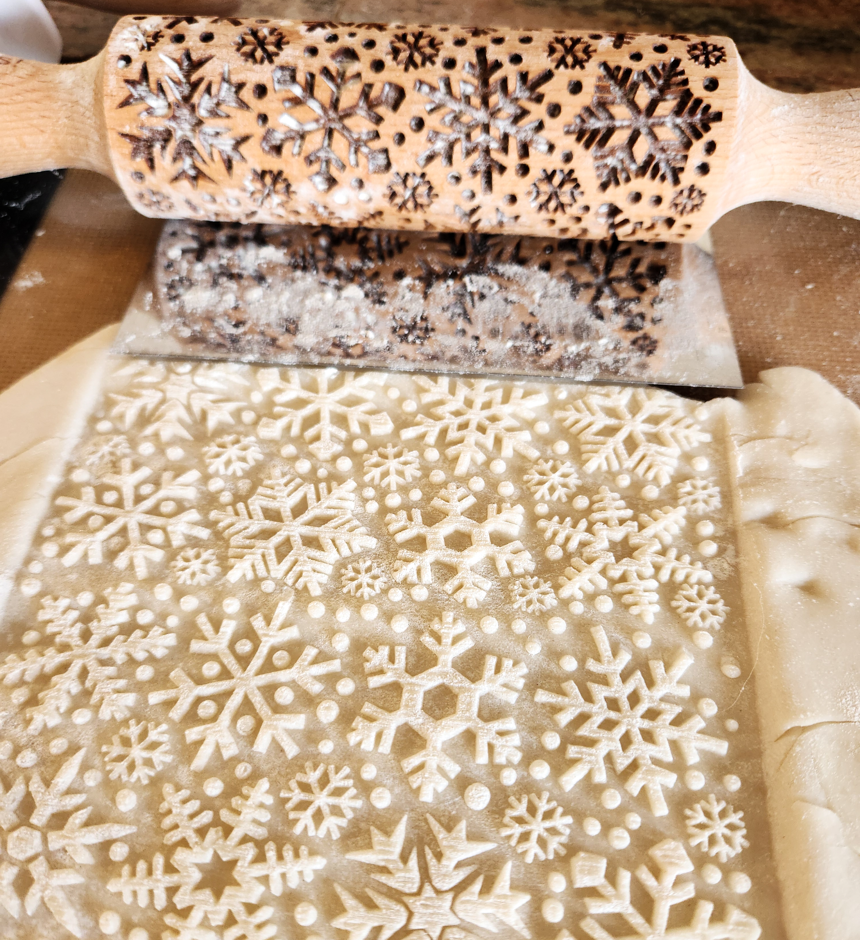 Generously flour your embossed pin and lightly dust the surface of the crust dough. Place a bench scraper at the end of your dough, and slowly roll towards you using a firm, even pressure. This is significantly stiffer than cookie dough so press harder than you would for cookies.