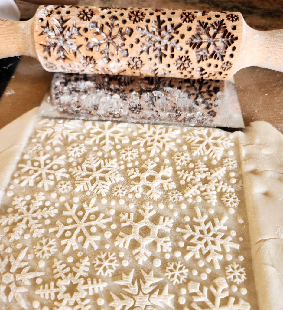 **Two more pin ideas! For a more whimsical, festive look for the holidays, you could try our Thanksgiving or Christmas pins, too! I think the large design version of both would work especially well. Here’s the photos from our product listings of these pins, shown with rolled cookie dough and baked cookies (some painted with luster dust). They would make adorable pies. ☺️