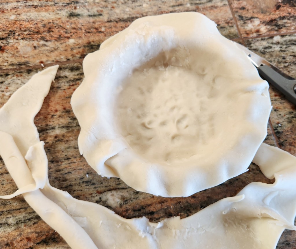 Cut out a circle of this dough that’s about an inch to and inch and a half WIDER than your pie dish. It helps to cut out a paper or waxed paper circle and lay that on top of the embossed dough. Use a knife to gently cut your circle out. Scoop away the excess dough. You can smoosh the excess up and press it into your pie dishes as bottom crusts. Works like a charm! Keep it covered until needed.