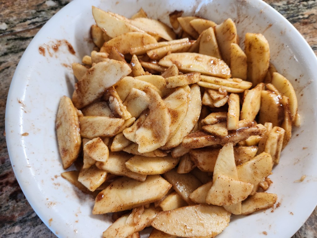 Toss them in the lemon juice in a large bowl. Add the sugar, flour, and spices mix and toss to coat the apple slices evenly. Cover and set aside.