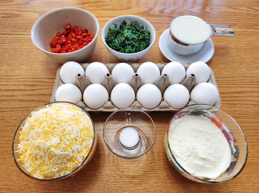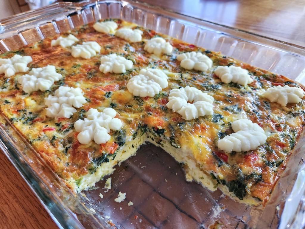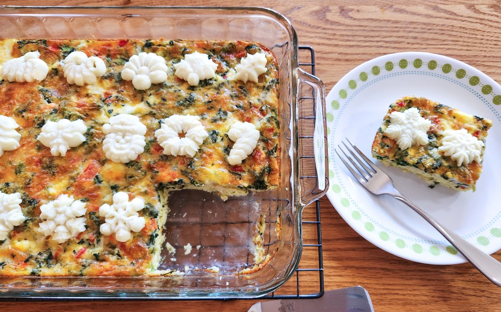 There are a zillion breakfast bake (breakfast casserole) recipes online, or you may have your own family favorite. I’ve included my own spinach and cheese breakfast bake recipe, but you can make these shapes to top any breakfast casserole.