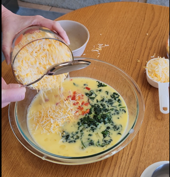 Whisk the eggs and milk in a large bowl. Add the remaining ingredients and mix well. Hold out 1/2 cup of shredded cheese to sprinkle on top.