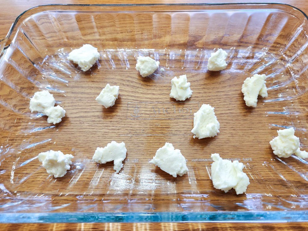 Press your potato-ricotta mix shapes out before you start putting the breakfast bake together. You want them in the freezer, setting, so they’re ready to place on the casserole about halfway through baking. Freezing them helps them hold their shape while you transfer them.