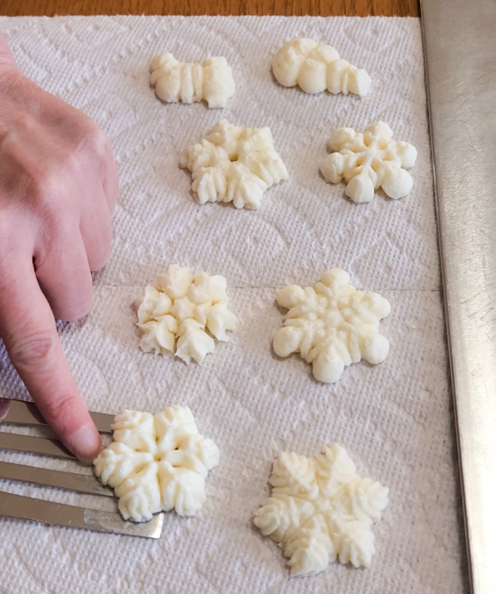 TIP: If you have any issues removing the shapes, dip your spatula in a cup of hot water. That can help get it under cold shapes. Wipe off any residue before re-dipping the spatula and lifting the next shape. You can alternatively try a little flour on the spatula.