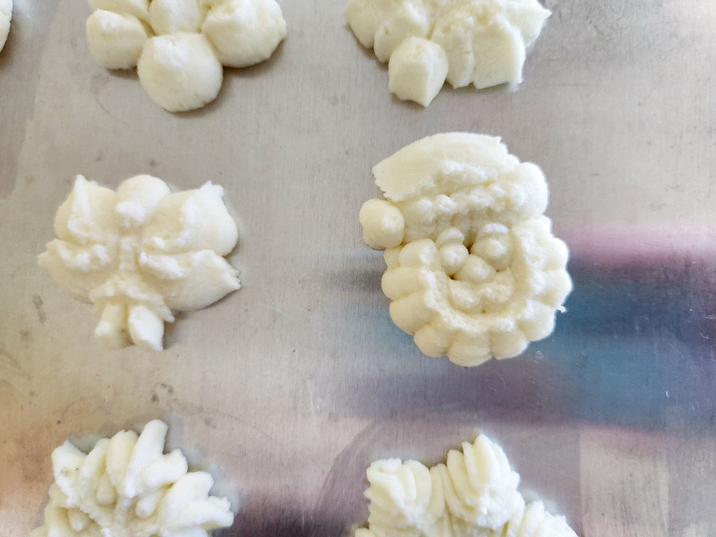 Load the mixture into your press with a spoon, packing it in to remove any air bubbles as you go. Start pressing your shapes. NOTE!!!! This mixture is NOTHING like cookie dough! It is so soft and presses with barely any pressure. Don’t expect to use a “full click” per shape on your press. Hold back and practice a few shapes to see how much pressure to use. It isn’t much! If your mix is smooth, thick, and still a bit cold, the shapes should press beautifully. Don’t feel frustrated if it’s weird compared to cookie pressing, It was weird for me, too. 😂 You’ll make some mistakes and goofy-looking shapes. I did, too. Scoop them up and throw them back in the bowl to be re-pressed. Go slow and gentle and you’ll get the hang of it. I made more shapes than I needed for the top of the casserole in case any broke when transferring. None did, so I ate the extras. 😉 Yum.