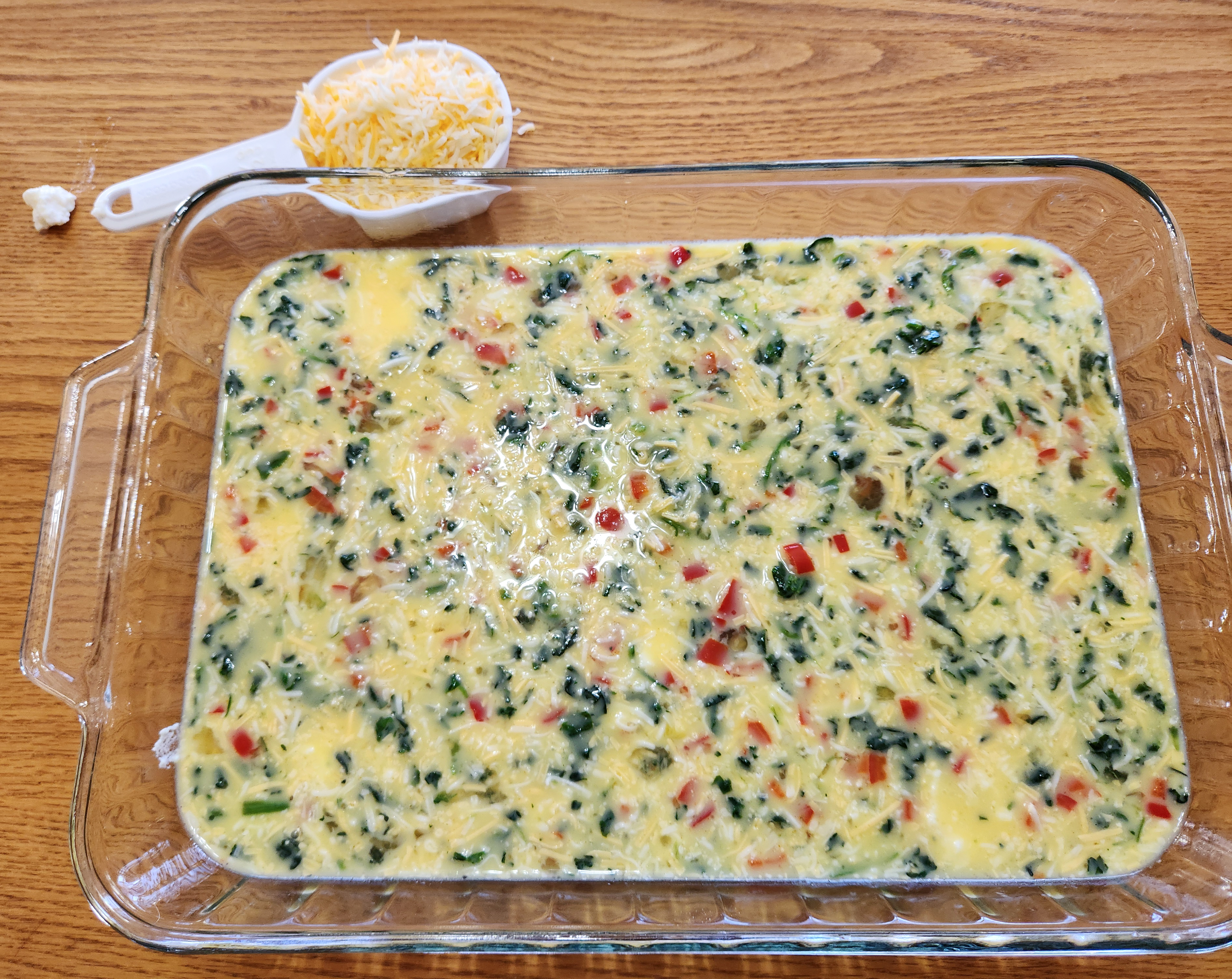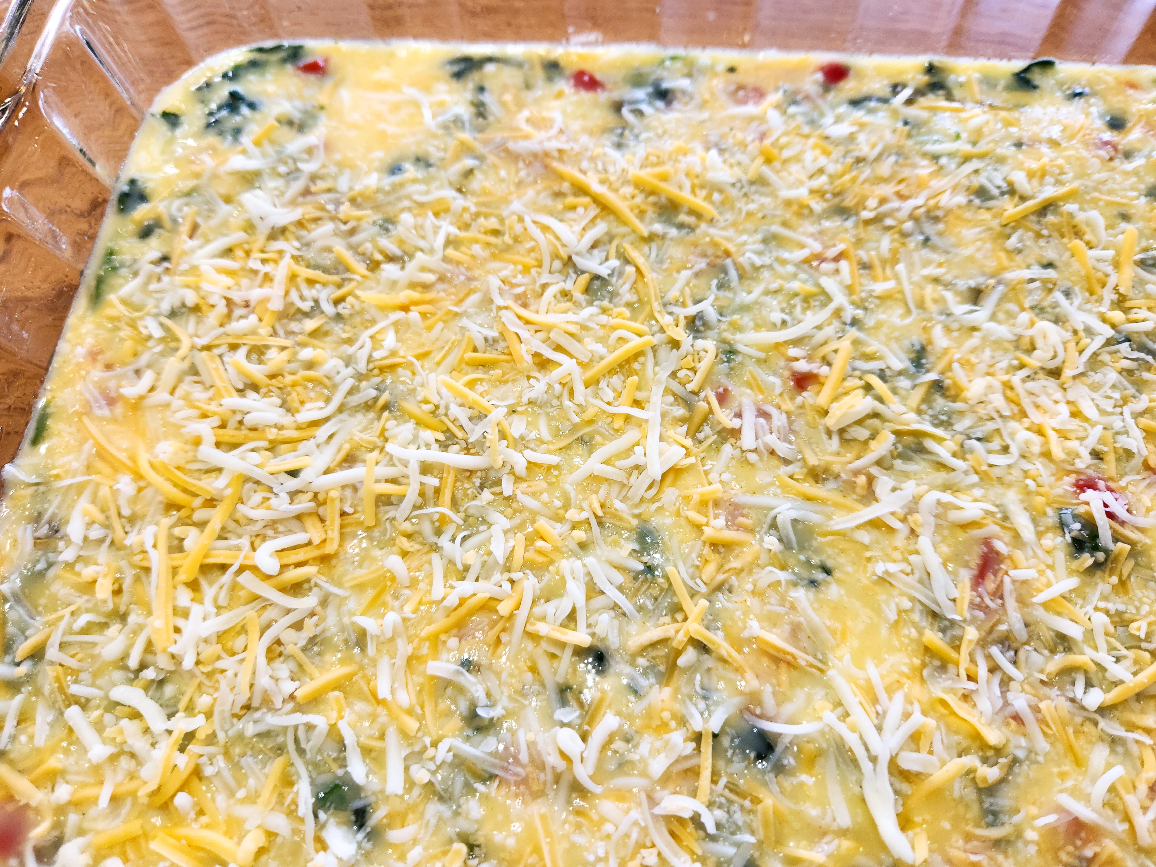 Whisk the eggs and milk in a large bowl. Add the remaining ingredients and mix well. Hold out 1/2 cup of shredded cheese to sprinkle on top.