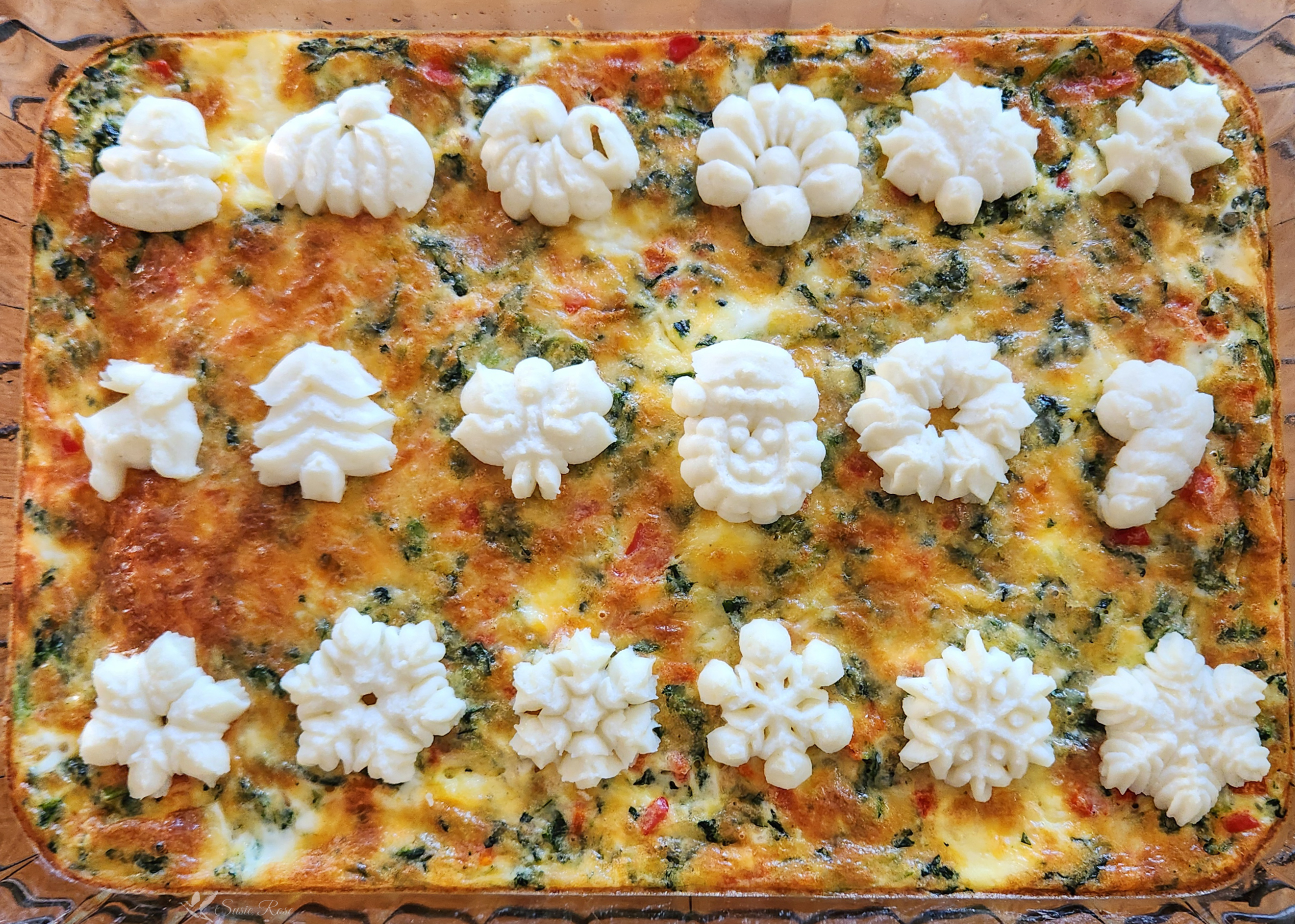 There are a zillion breakfast bake (breakfast casserole) recipes online, or you may have your own family favorite. I’ve included my own spinach and cheese breakfast bake recipe, but you can make these shapes to top any breakfast casserole.