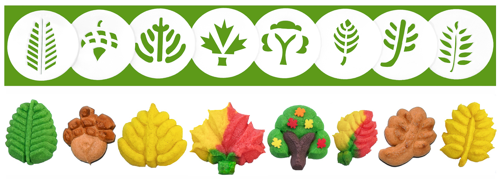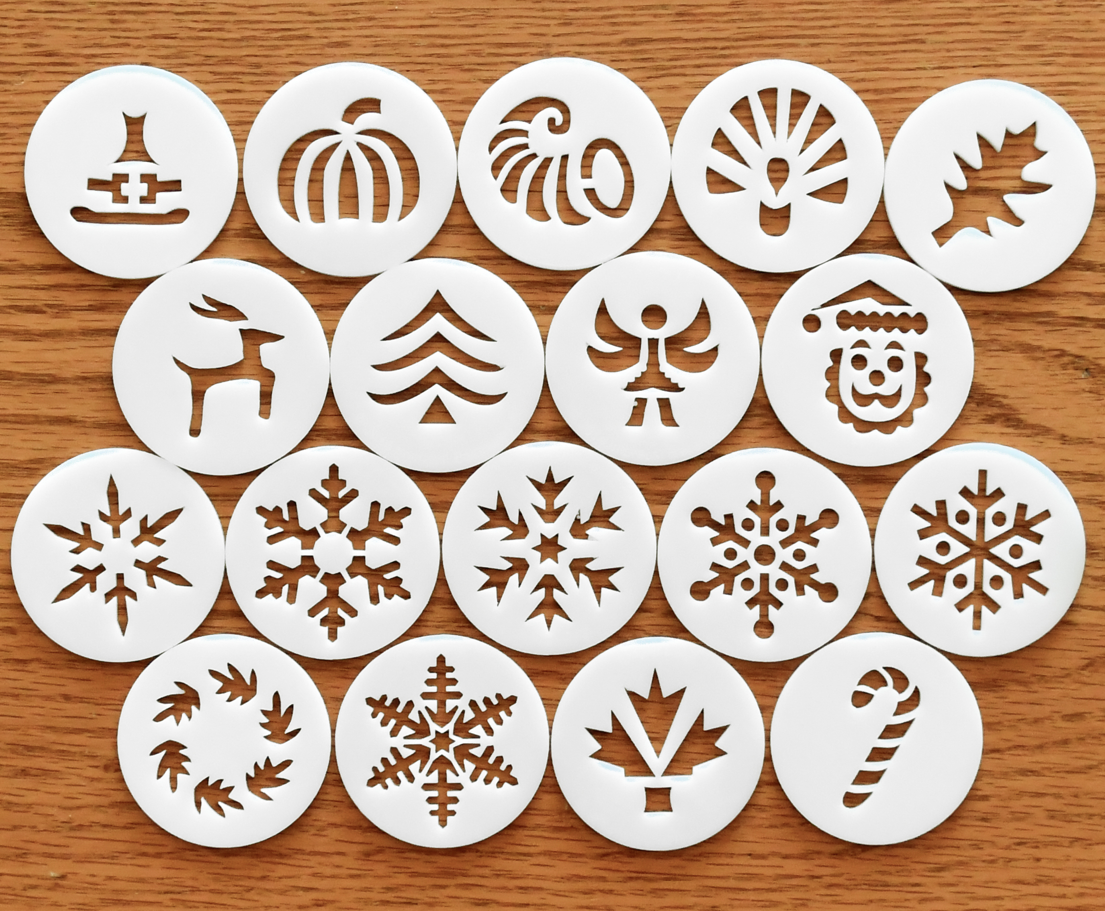 I used a mix of disks from our Christmas, Snowflakes, “More Snowflakes”, Thanksgiving, and Leaves disk sets to show some Holiday-themed ideas. We have 367 disk shapes so you have a lot to choose from. I show these 5 disk sets at the bottom of the page.