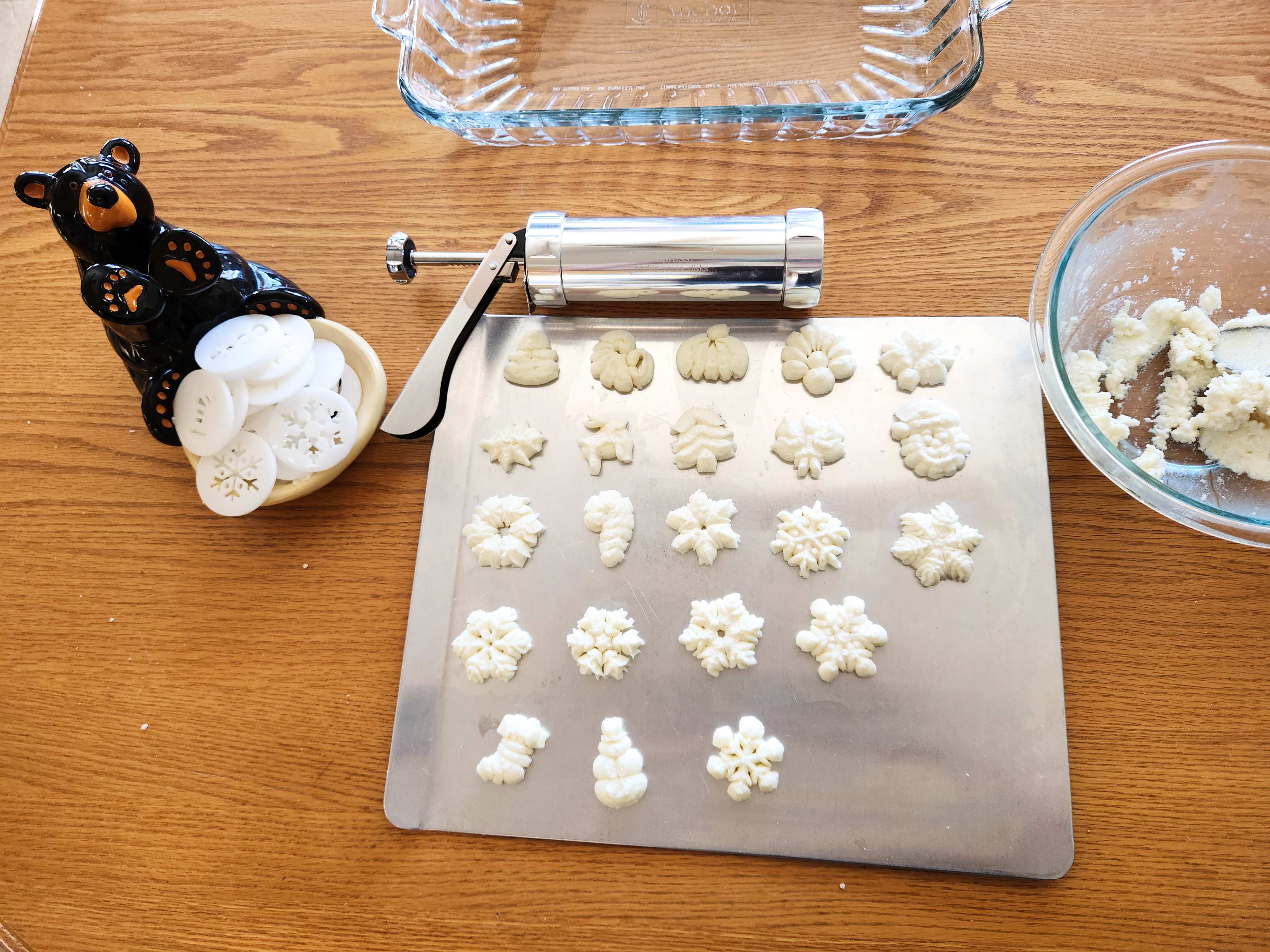 Gather disks, press and cookie sheet. If you have one, use a cookie sheet with no rimmed edges – flat edges with no rim make it easier to get the shapes off! I set my disks in the casserole dish to see how many would fit and what order the shapes would be cute in.