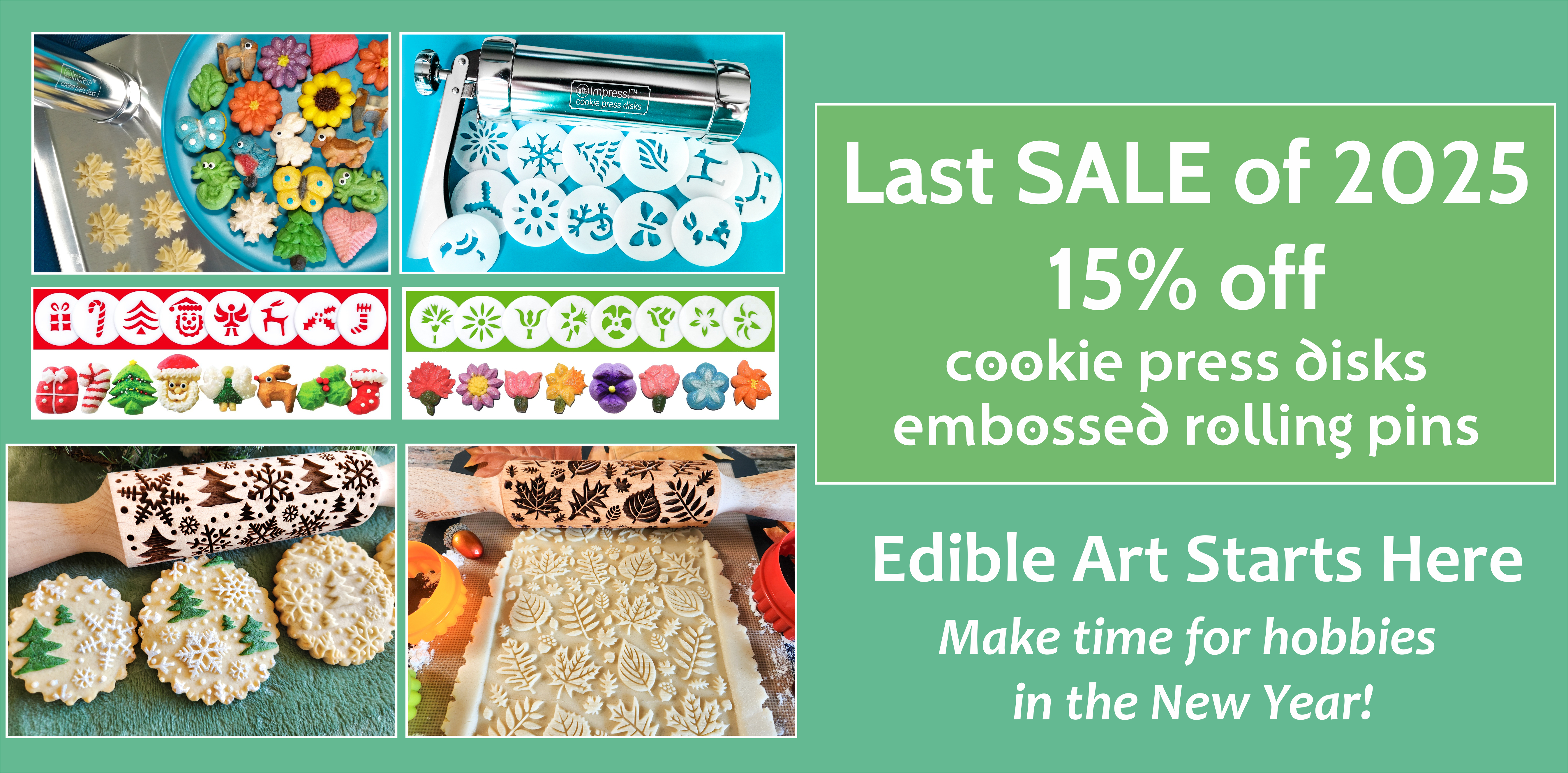 Discount on our cookie press disks, cookie press, embossed rolling pins, luster dusts, cookie cutters & baking accessories. Sale December 26 – January 4, 2026, on our website and Etsy shops ONLY! (Links below) Sale excludes holiday gift sets and our recipe book.